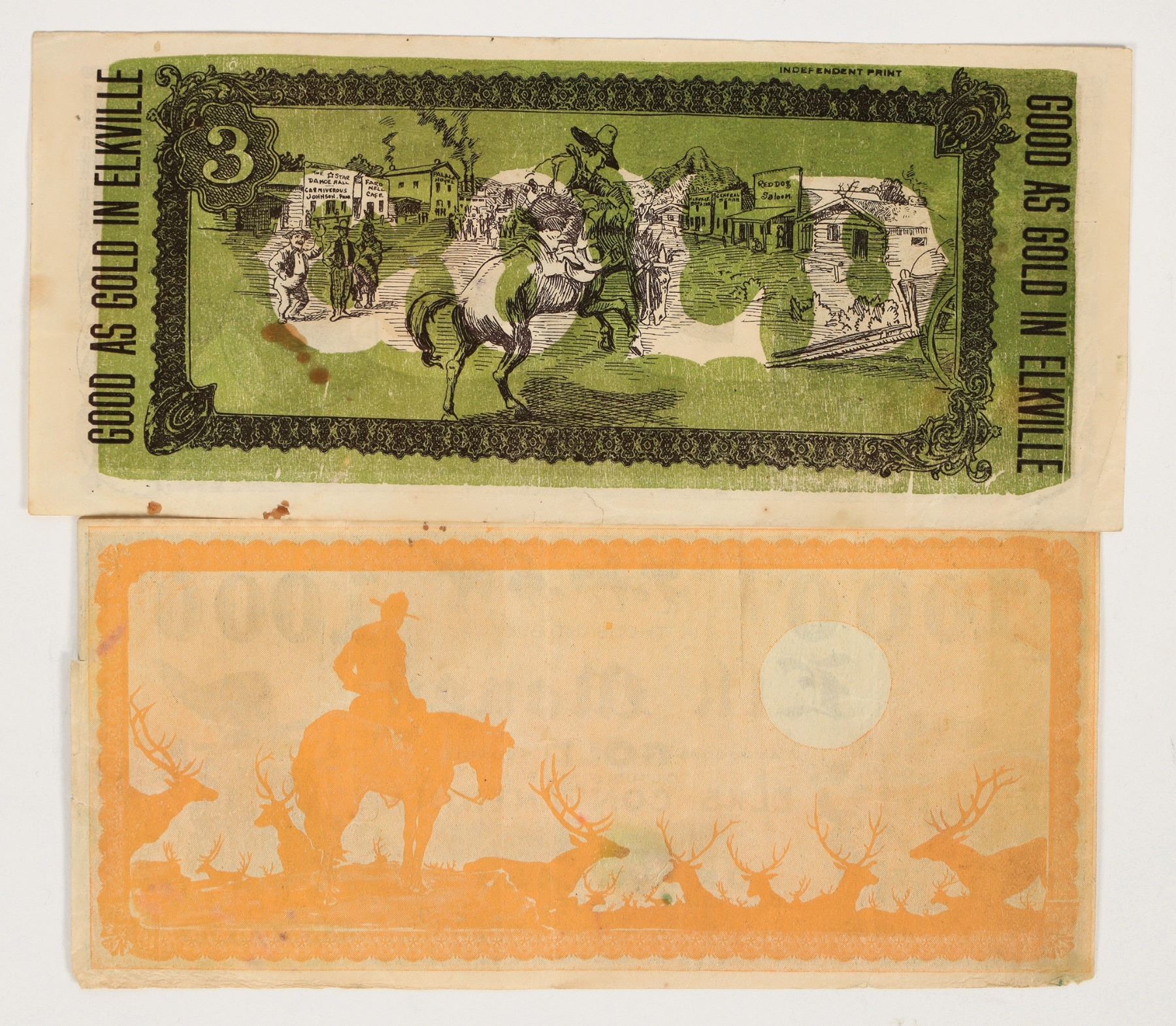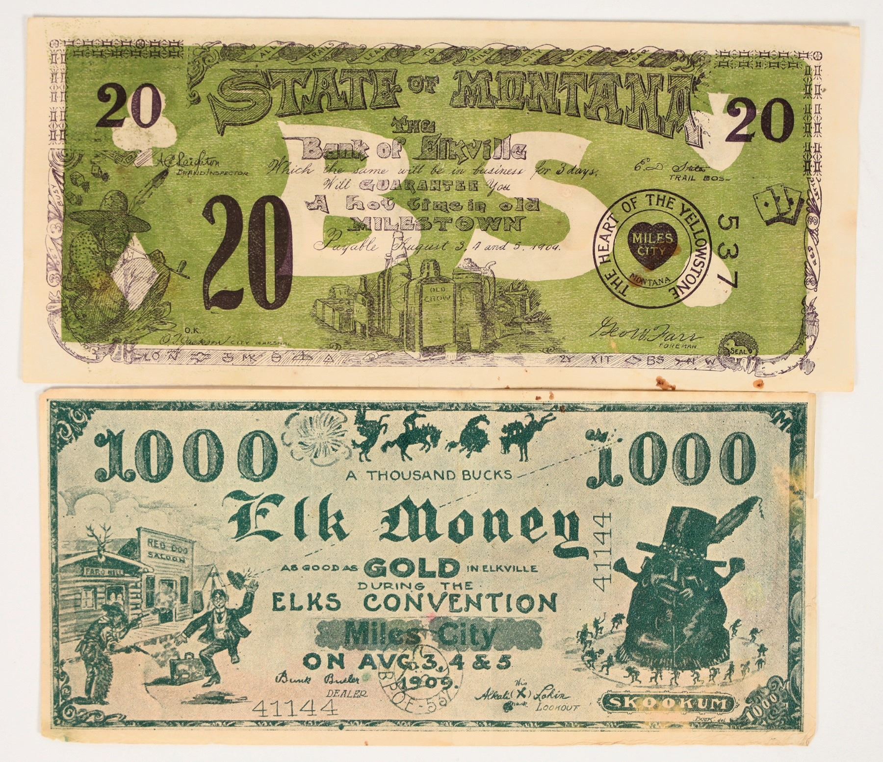 Two fanciful convention notes from their August 1909 convention at Miles City: 1) "Bank of Elkville will guarantee you a hot time in Old Miles Town, 20 payable August 3-5, 1909." 7 x 3.25" 2) "A thousand bucks Elk money, as good as gold in Elkville, August 3-5, 1909." 3 x 6.5" These are fanciful convention note, from Chapter 537, at their 1909 convention at Miles City. This Miles City Chapter 537 was chartered in 1900 and is still going strong today.