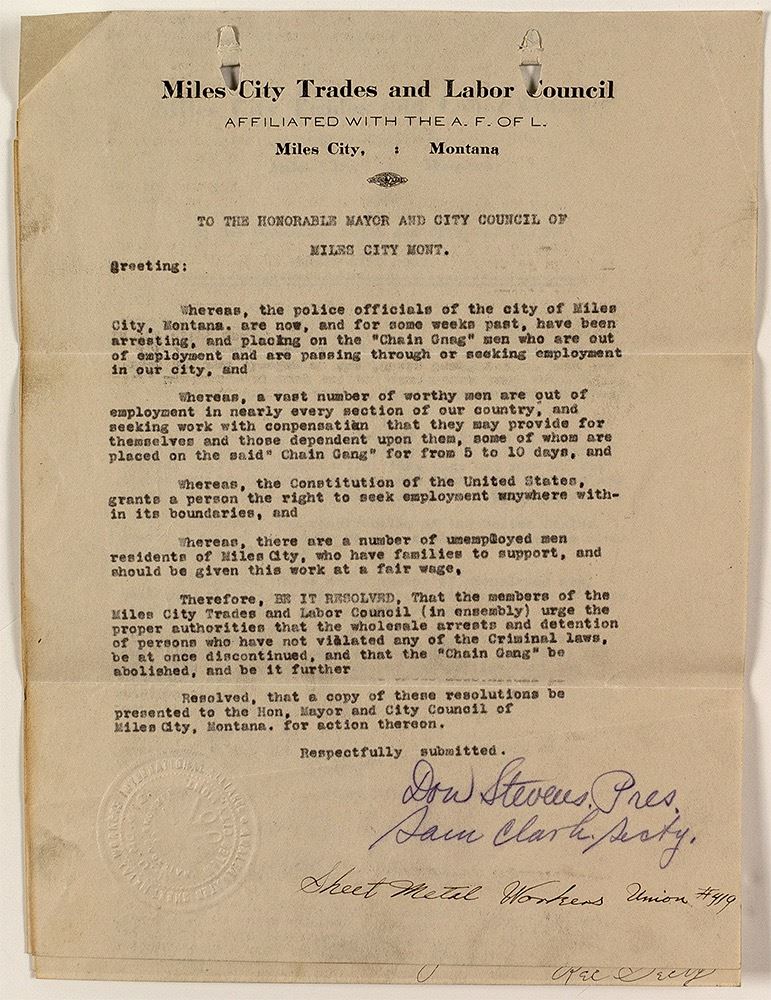 5 Letters from the great depression from the Miles City Trades and Labor Council, associated with the American Federation of Labor, to the City Council and Mayor regarding the police activity of placing unemployed workers and job searchers on road chain-gangs. Signed and by 5 different labor unions and organizations including a "Vigilante 66". Great depression police-labor ephemera. City: Miles City State: Montana, Date: 1930's Inventory# 40876