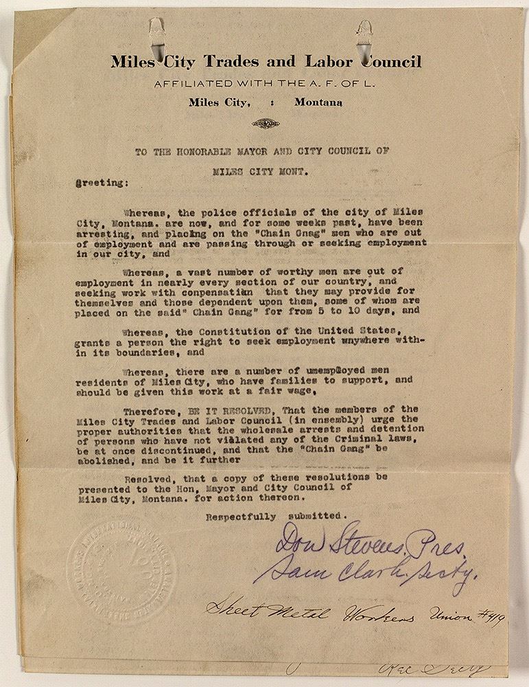 5 Letters from the great depression from the Miles City Trades and Labor Council, associated with the American Federation of Labor, to the City Council and Mayor regarding the police activity of placing unemployed workers and job searchers on road chain-gangs. Signed and by 5 different labor unions and organizations including a "Vigilante 66". Great depression police-labor ephemera. HWAC# 40876 Date: 1930's Location: Miles City, Montana
