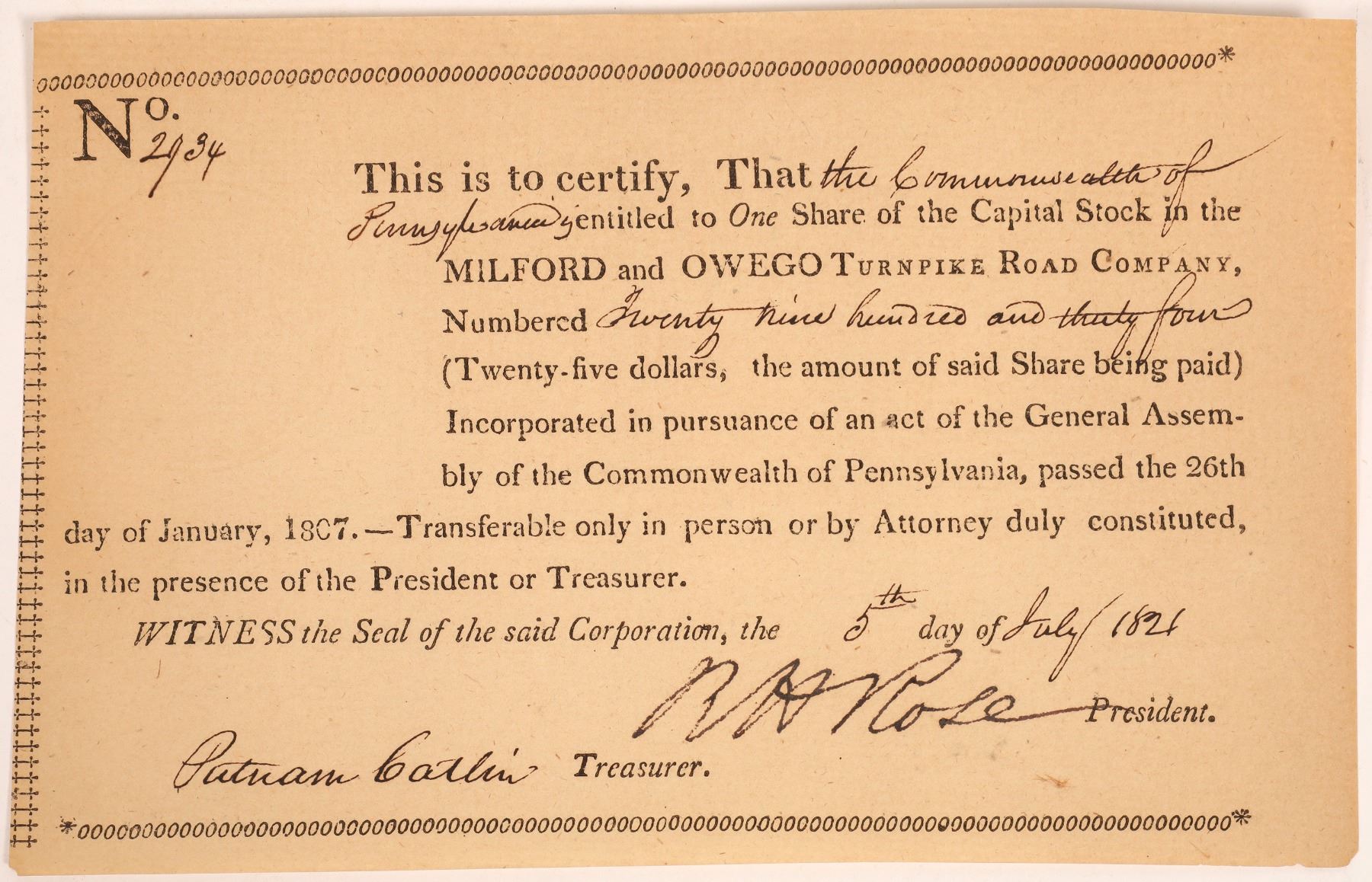 No. 2934, issued for one share to the Commonwealth of Pennsylvania on July 5th, 1821. Signed by president RH Rose and treasurer Putnam Catlin. Not cancelled. 4 x 6.25" Toning. Inc. in 1807. The road ran from Milford, PA to Owego, NY via Willsonville, Palmyra, Dyberry, Canaan, Rix's Gap, and Montrose. According to Wayne County history, "There were eight toll gates on the Milford-Owego Turnpike. Gatekeepers received a 10% commission. The gate near Waymart was one of the most profitable, collecting around $1,000 in 1830. Stage travel on the turnpikes reached its zenith about 1836. Canals and railroads carried freight and passengers at a fraction of the cost and led to a drop in use of the turnpikes after that. They later became part of the public highway system."