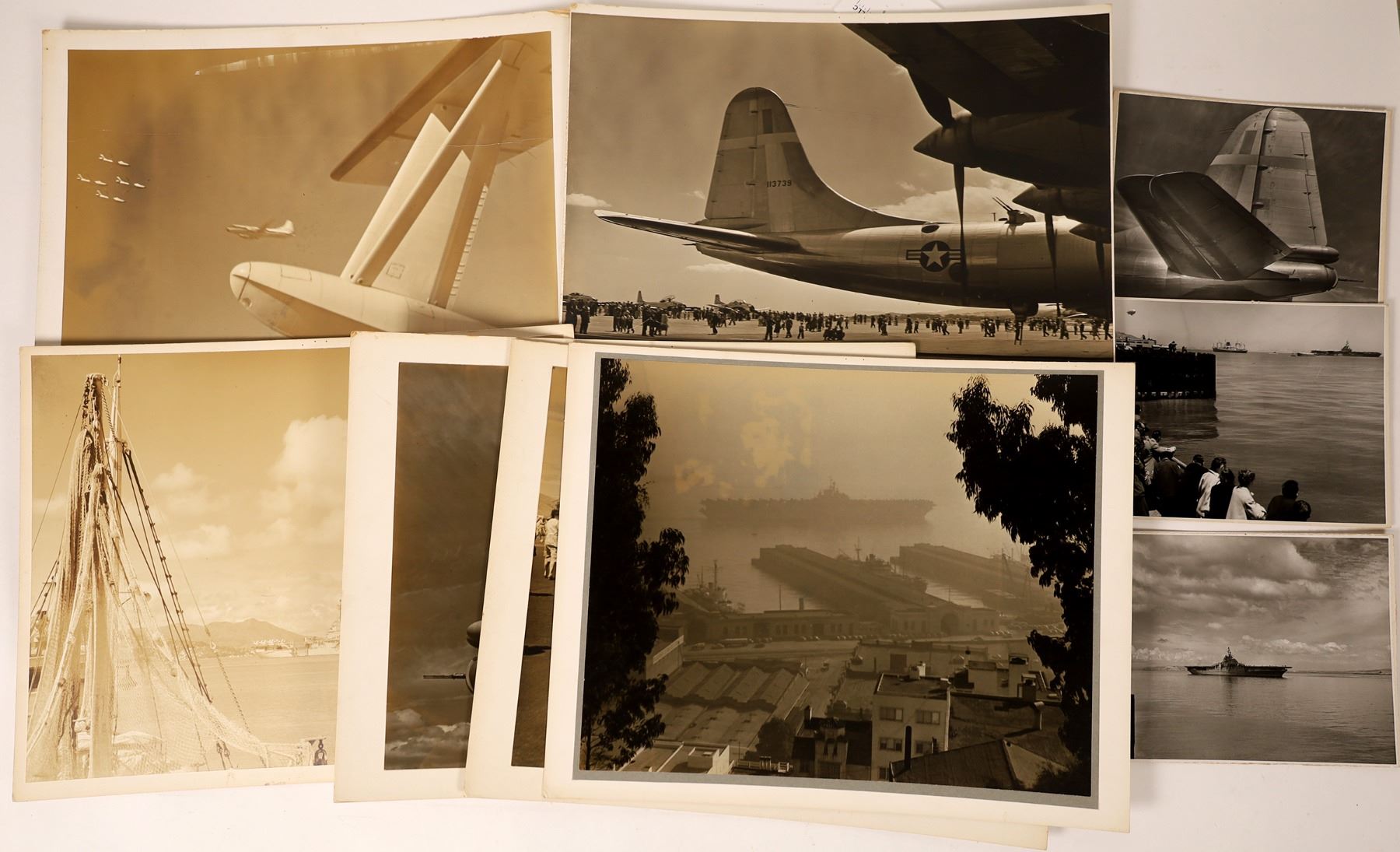 The small photos show an aircraft carrier in San Francisco Bay and the tail section of a large bomber.