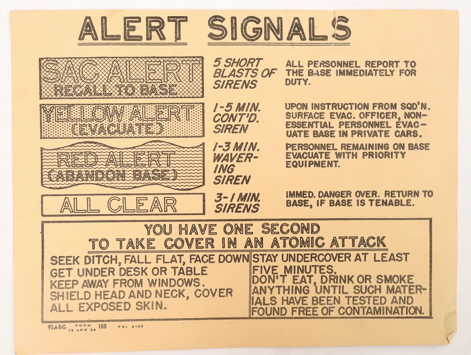 This is an alert card used by the military to warn personnel in case of a nuclear attack. It's dated April, 1956 and obviously was in the possession of the piece, as is evidenced by the cartoon drawings on the reverse. Unfortunately, the signature of the illustrator is unreadable It measures 8"x 10" and is made from card stock. Has some smudging and a dogeared corner. Please see photos for more details.