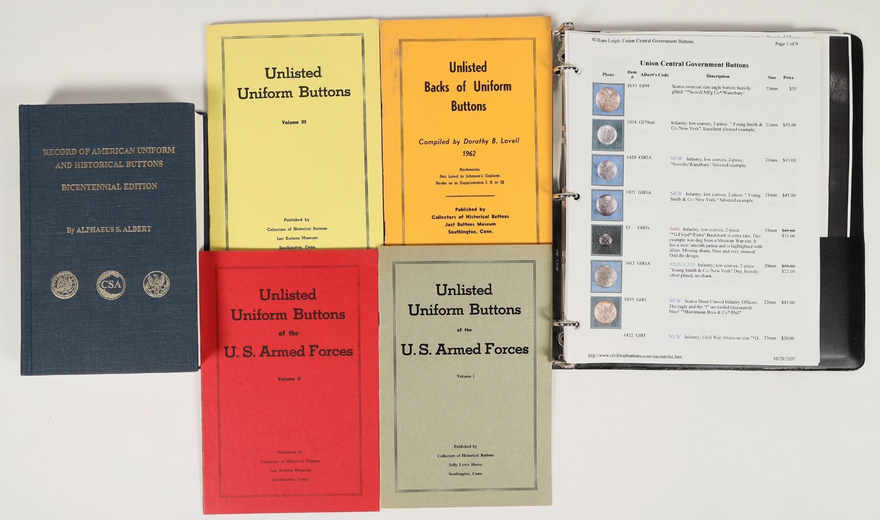 Group of 6 collector's guides on military uniform and historical buttons. Lot includes 1 hardbound book, 'Record of American Uniform and Historical Buttons' by Alphaeus S. Albert; 4 pamphlets published by Collectors of Historical Buttons; and 1 binder containing printed reference sheets. See photos for detail.