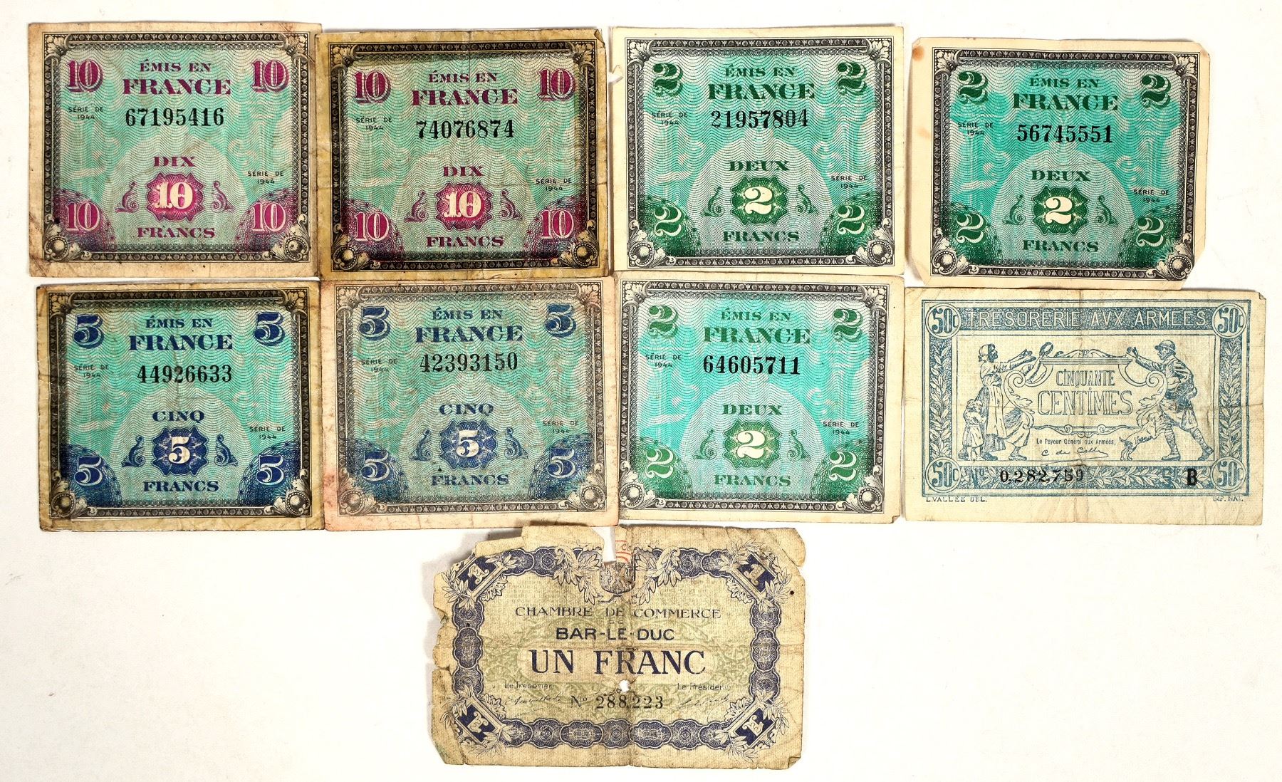 Military currency of France. 1917: cinquante centimes (50 cents); one franc. 1944: two francs (3); five francs (2); ten francs (2).