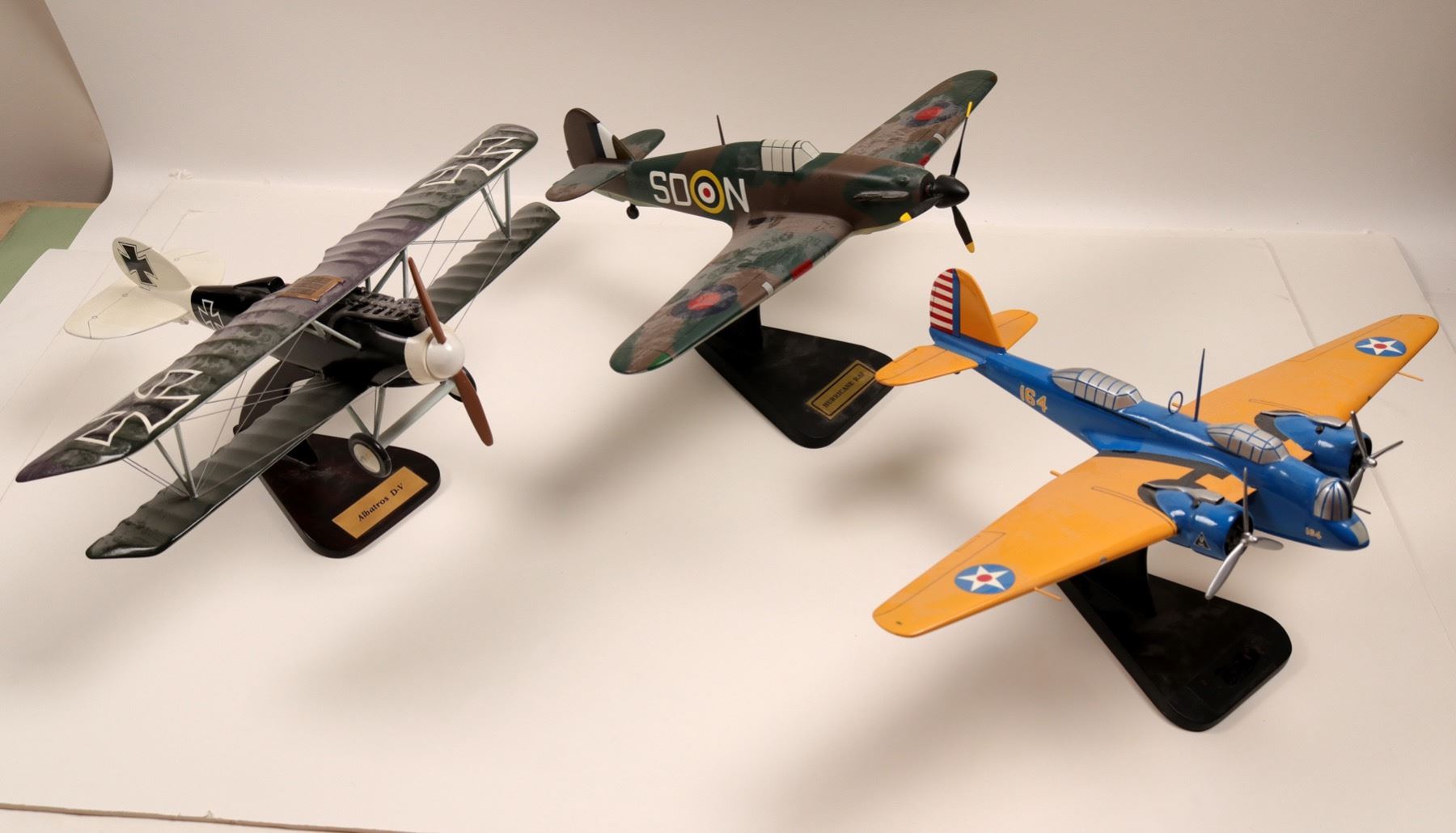 Three aircraft w/stand and in excellent condition. 1.Martin B-10B was the first all-metal monoplane bomber to be regularly used by the United States Army Air Corps. Yellow/Blue Army/Air Corps makings. 2. Hurricane RAF, camo paint, "SD N" markings. 3. Albatross D-V b;ack/white paint w/German cross. City: State: Date: 1900-40's