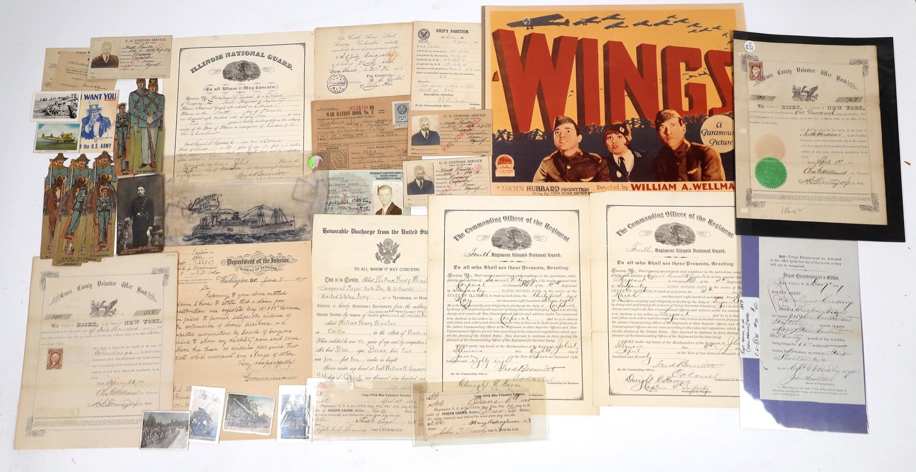Cloth souvenir USAT Hunter Liggett. 1865 Ohio paymaster receipts x2, Fort, NM 1867 forage sheet, 1919 Army Honorable Discharge, 3x Illinois National Guard 1888-90 honorable discharges, 1890 pension letter, 2x 1865 Essex County, NY War Bond docs, War Ration Book, ID cards. Hollywood "Wings" film promo card 11x14".