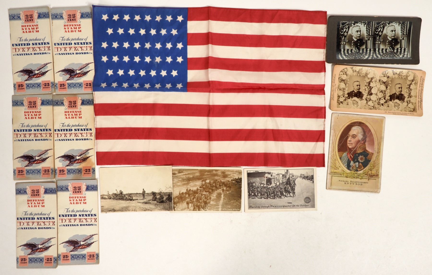 Lot of 13. Includes: two different Admiral Dewey stereoviews; six unused World War II Defense Stamp Albums; three postcards incl. 2 real photo; and a 46 star US flag, 12 x 16.5".
