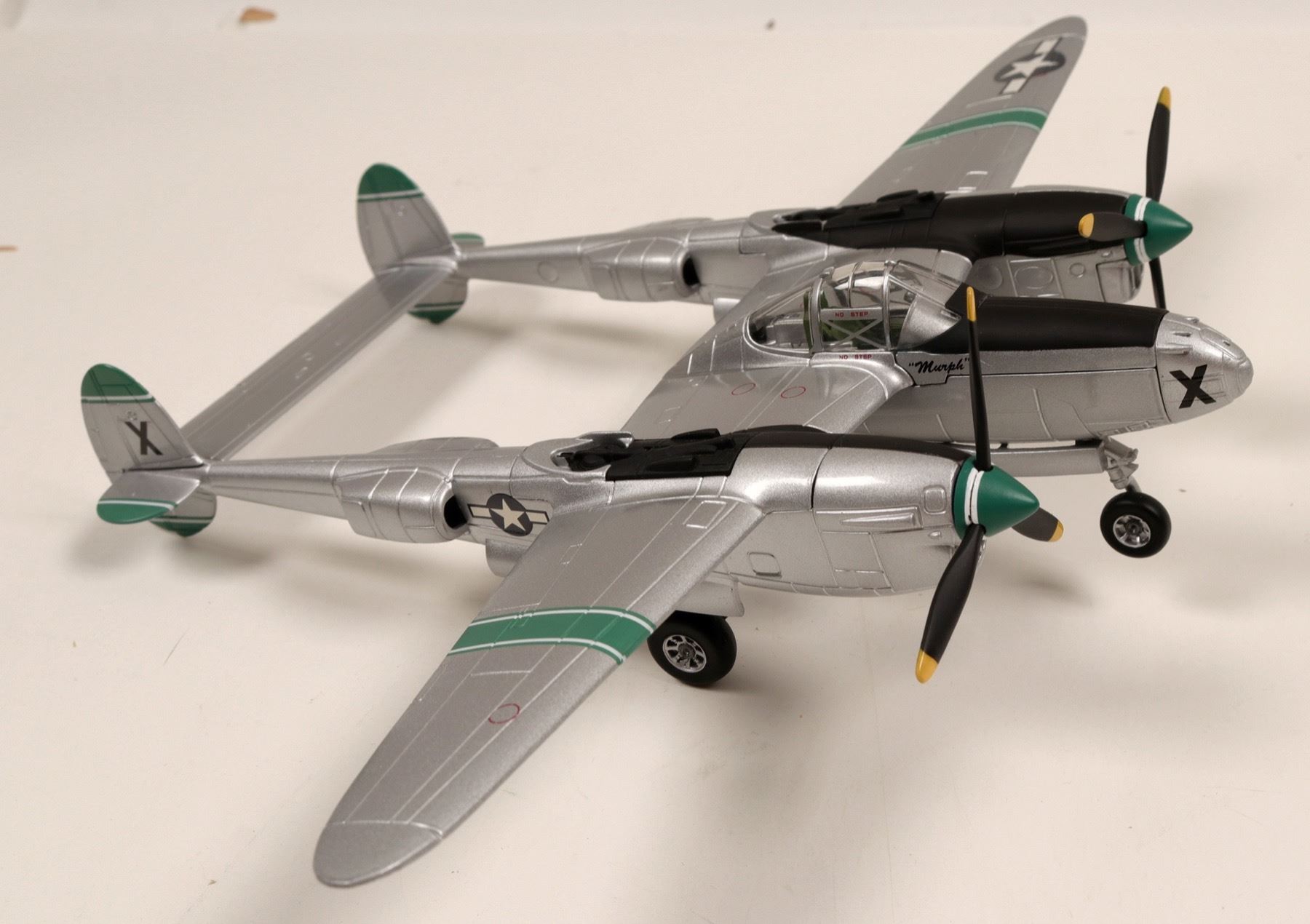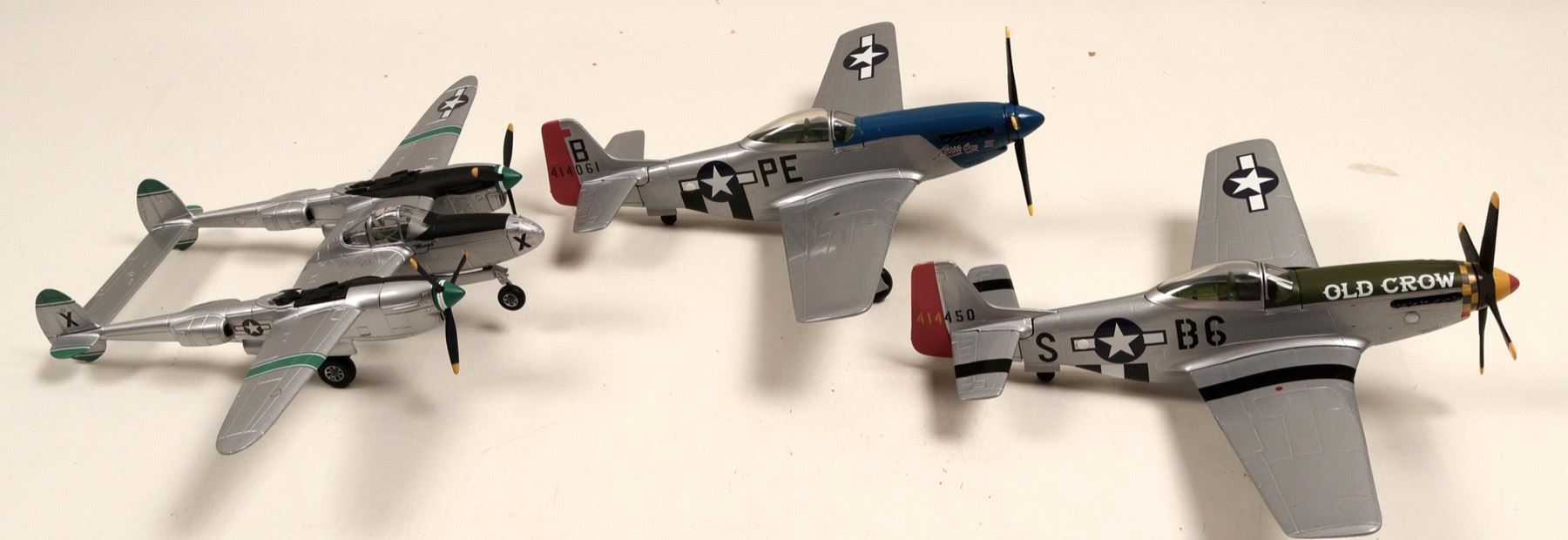 Three metal cast model aircraft NIB. These are very detailed collectibles signed by the pilots that flew them,. complete with a COA and full marking on the aircraft. 1. P-38 Lightening "Sweet Sue". signed by Paul Murphy Jr.. 2. P-51D "Little One III" Capt Donald S. Bryan Signature. 3. P-51D "Old Crow" Clarence "BUD" Anderson signature. City: State: Date: 1940'