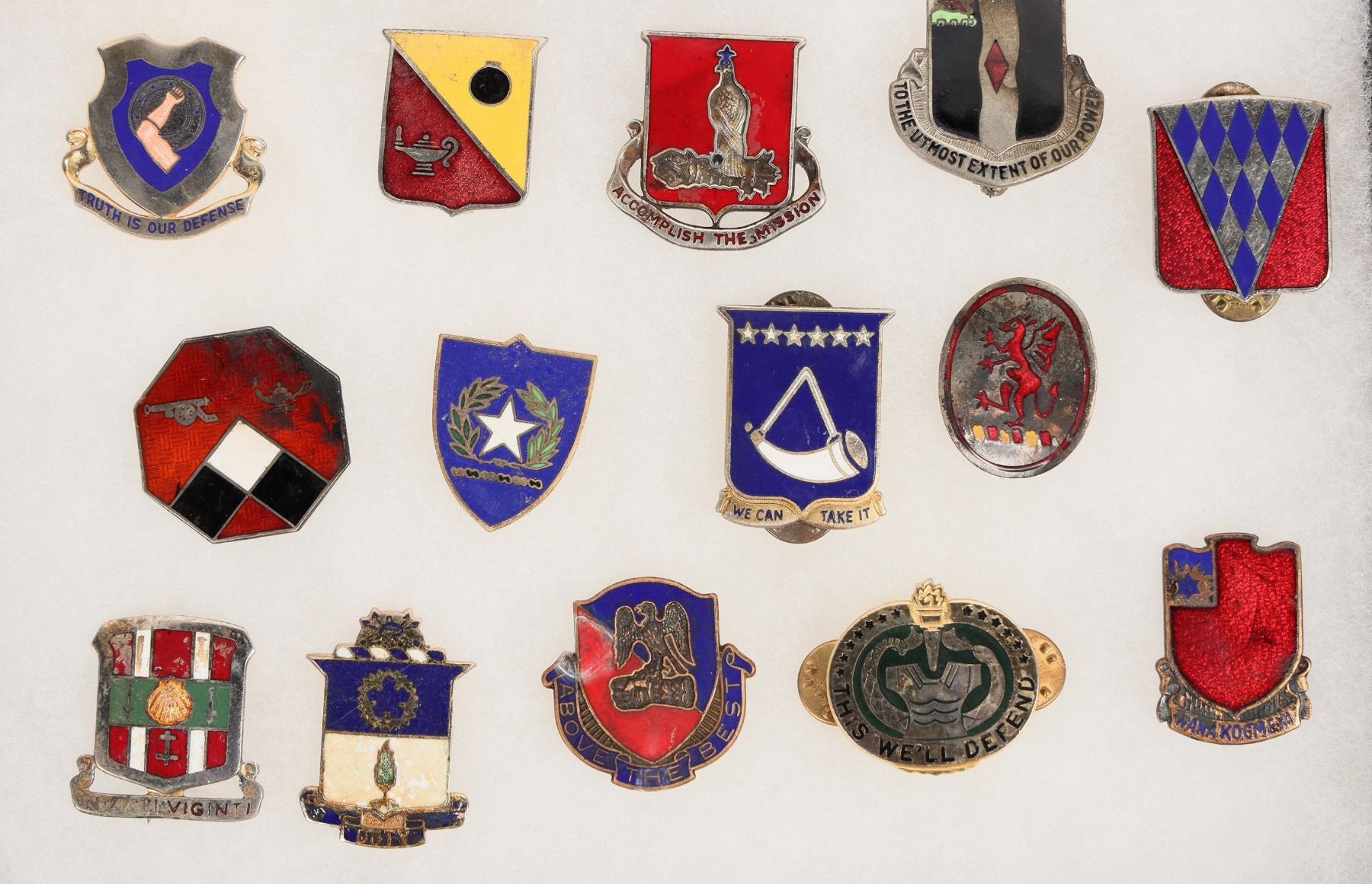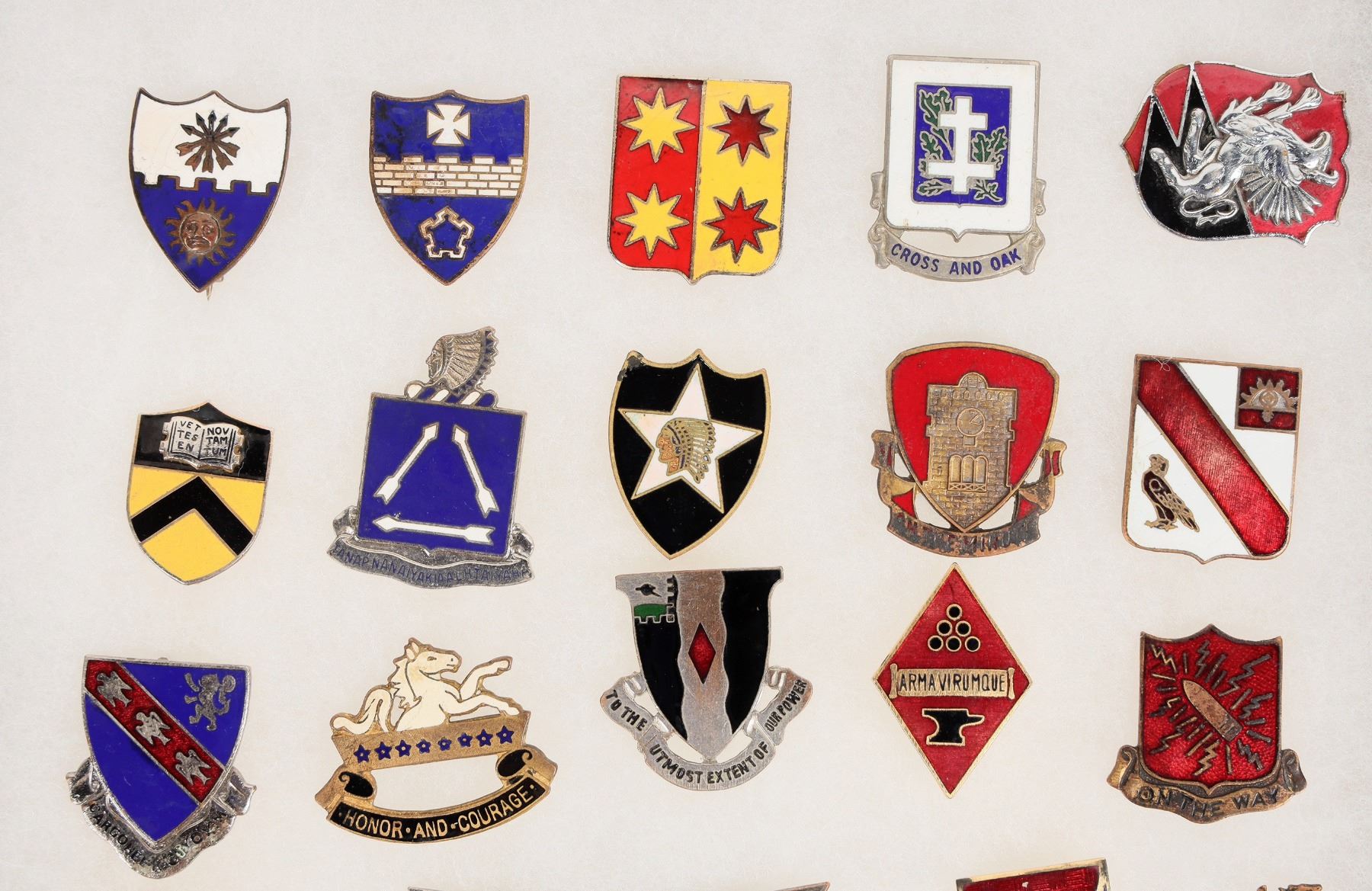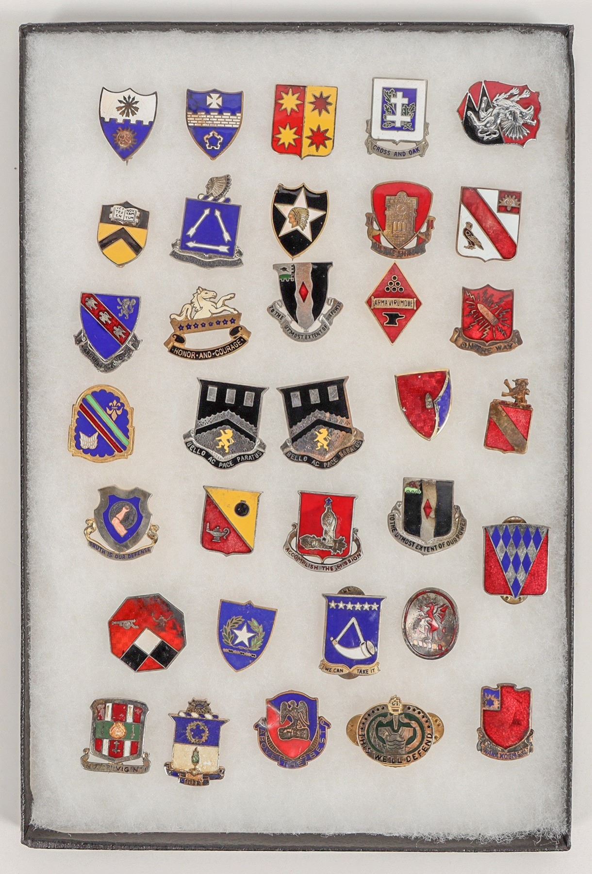 Riker box of 34 military insignia pins. Multi colored enameled with wonderful mottos: "truth is our defense;" "we can take it," and many more.