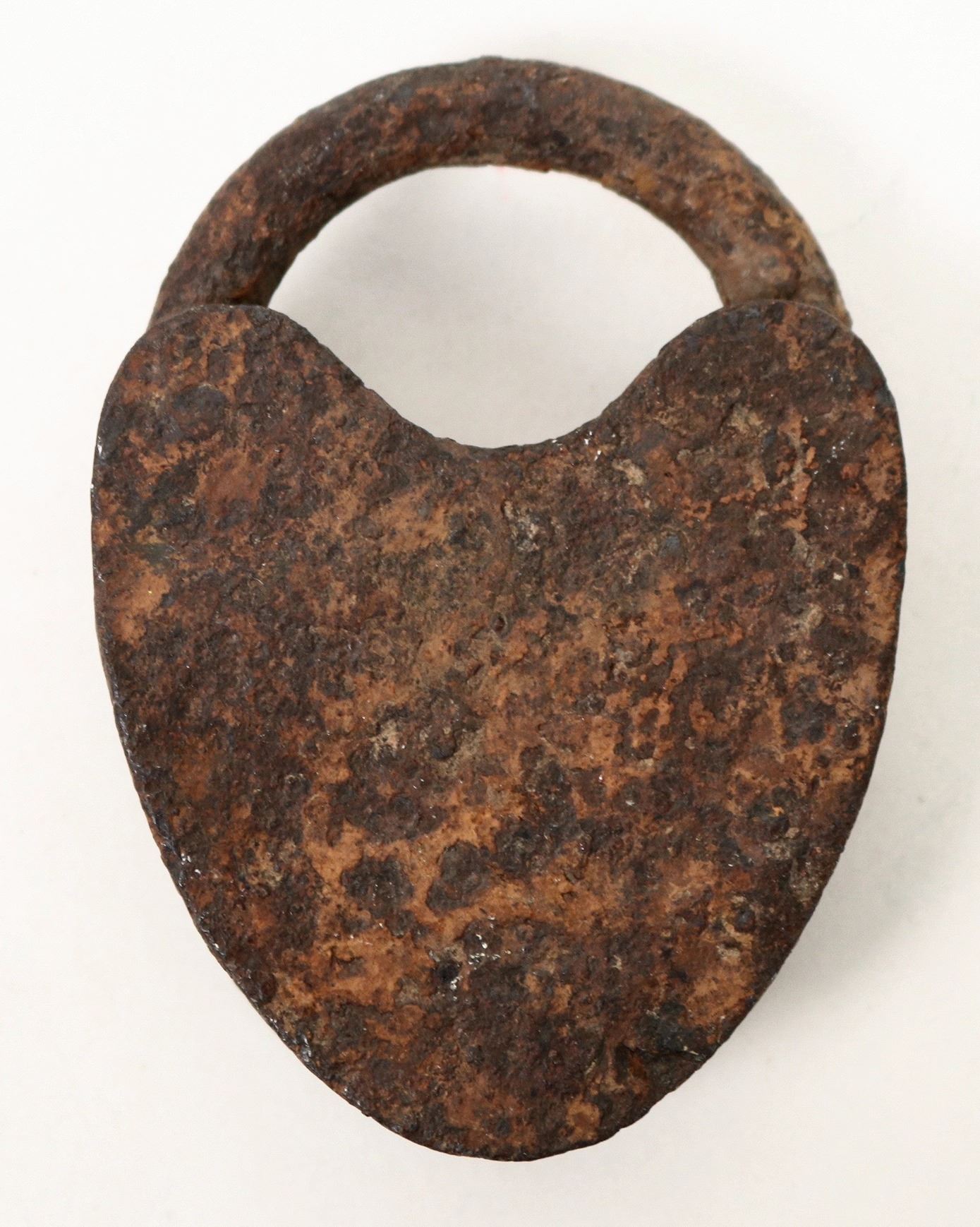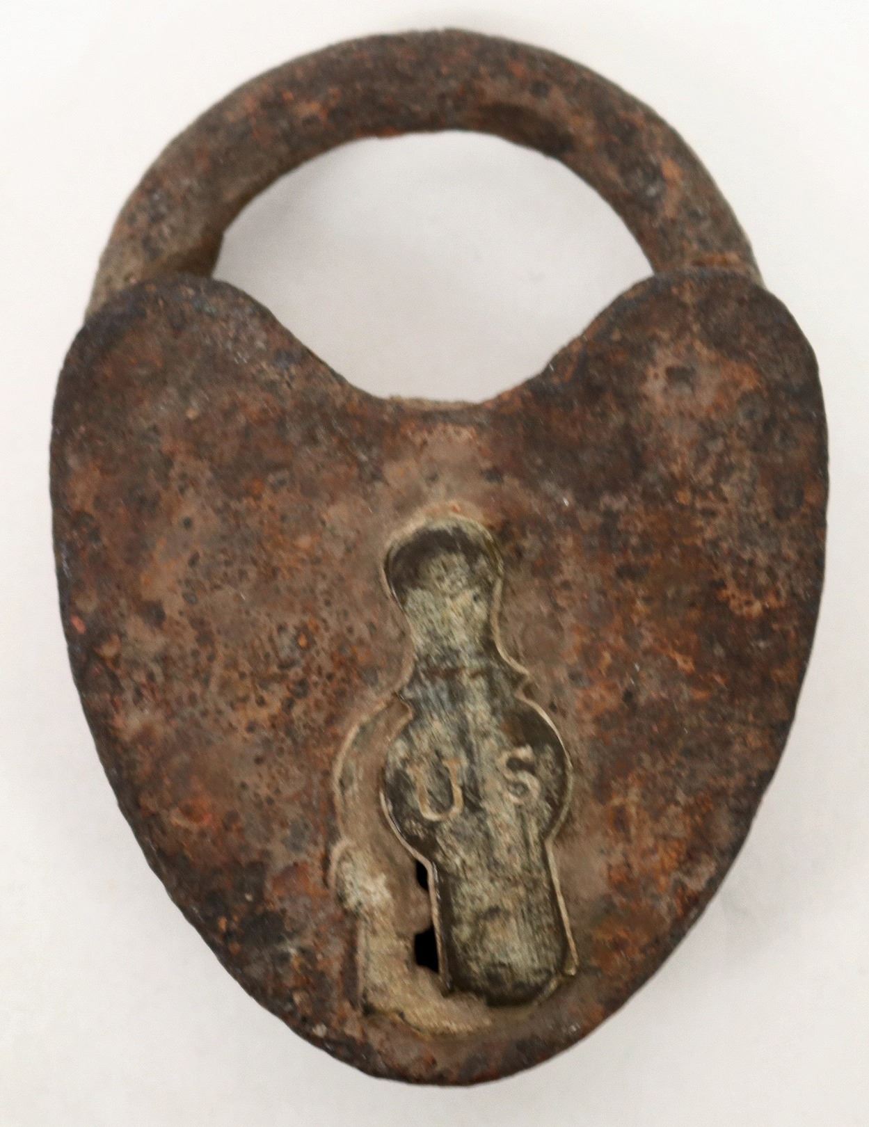 Military lock with U S on frozen key cover. Dug in Carson City, NV c. 1965, this is possibly U S Mint related. 3.25x2.25", rusty and bottom degradation. Please inspect.