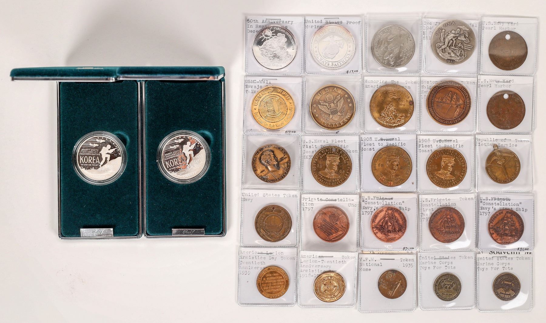 Lot of 27 medals pertaining to the United States armed forces. Two Korean War Memorial silver dollars in original U. S. Mint boxes; Longines Symphonette Iwo Jima silver medal. U. S. Frigate Constellation, Marine Corps, V.F.W., 1908 Naval Fleet; U. S. Navy Yard Pearl Harbor and others.