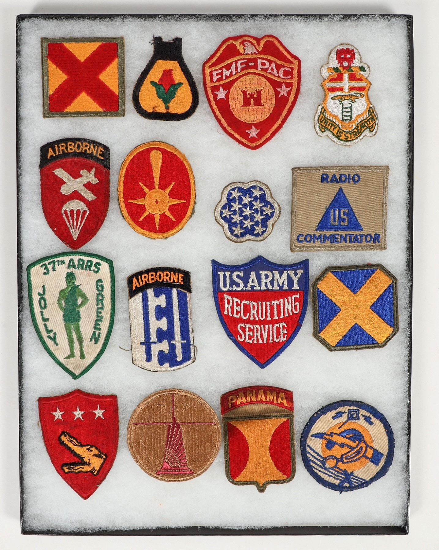 Most scarce or rare, sixteen patches mounted in a Riker box. Including: U. S. Army Recruiting Service; 37th ARRS Jolly green; Airborne; FMF-PAC; Radio US Commentator; Panama.