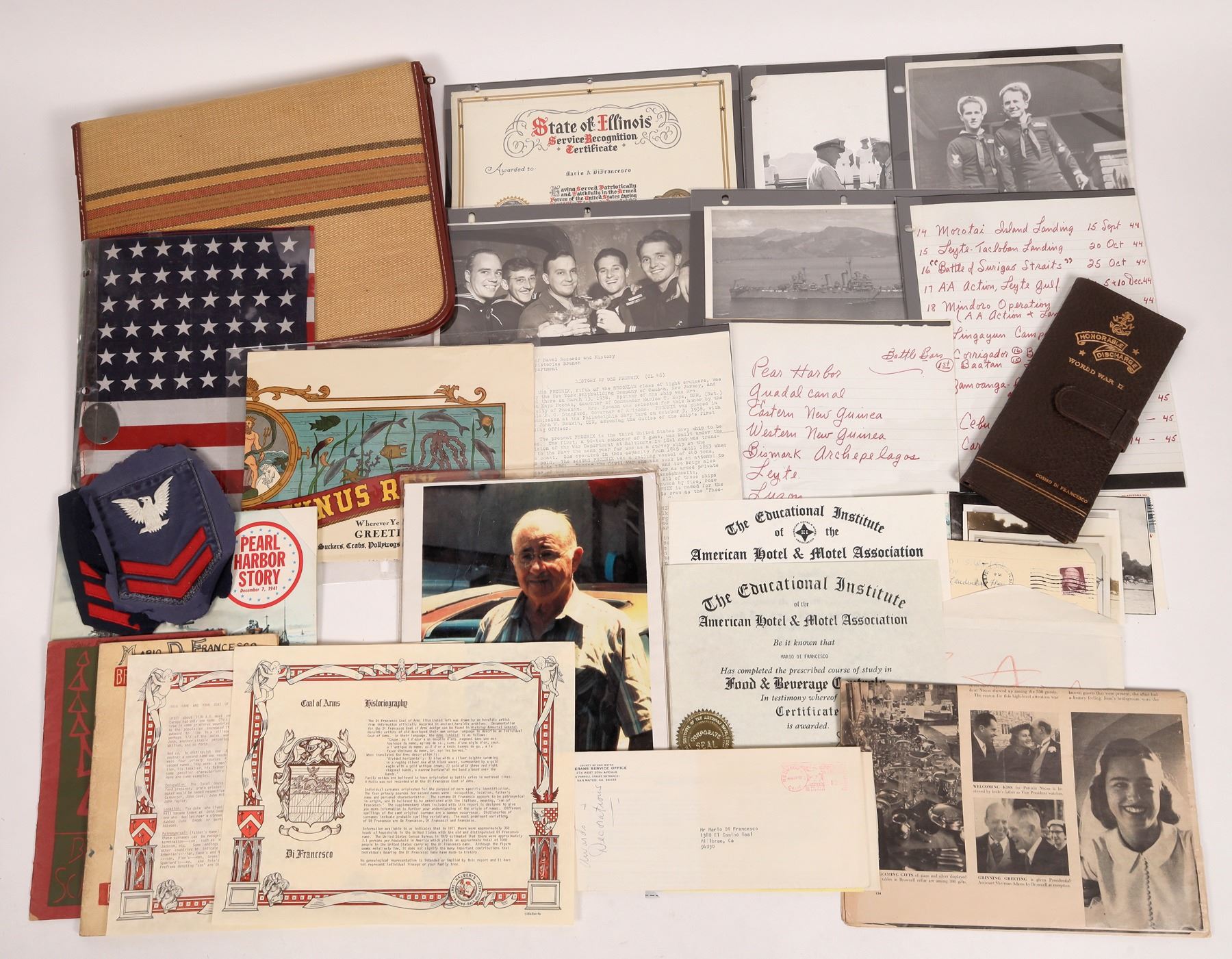 Military photos and personal mementos from Mario Di Francesco of Illinois. Original b/w military 8x10" photos of WW 2 naval scenes and Pacific landings with index, c. 1941-45. Dog tags, Navy patches etc. Nice personalized group.
