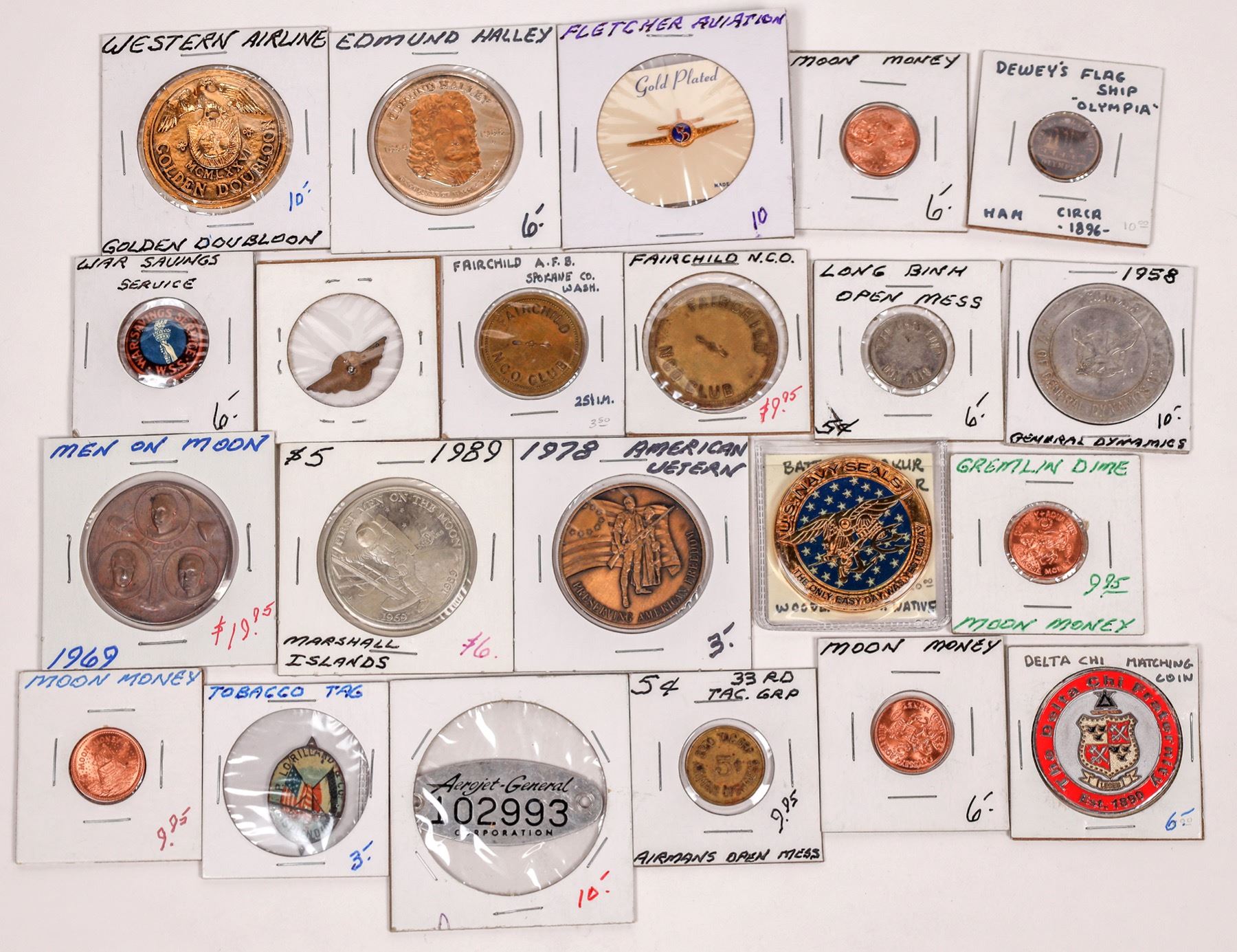Lot of 22 pieces pertaining to military, space and aviation. Gold plated pin from Fletcher Aviation; equipment tage from Aerojet-General Corporation; tribute medal to the first Navy Seal to die in Afghanistan in 2002; 1978 American Veteran; 1989 Marshall Islands; 1958 General Dynamics; moon money; Western Airlines; Dewey's flagship "Olympia:; Long Binh open mess; Fairchild A.F. B.; Edmund Halley. City: State: Date: