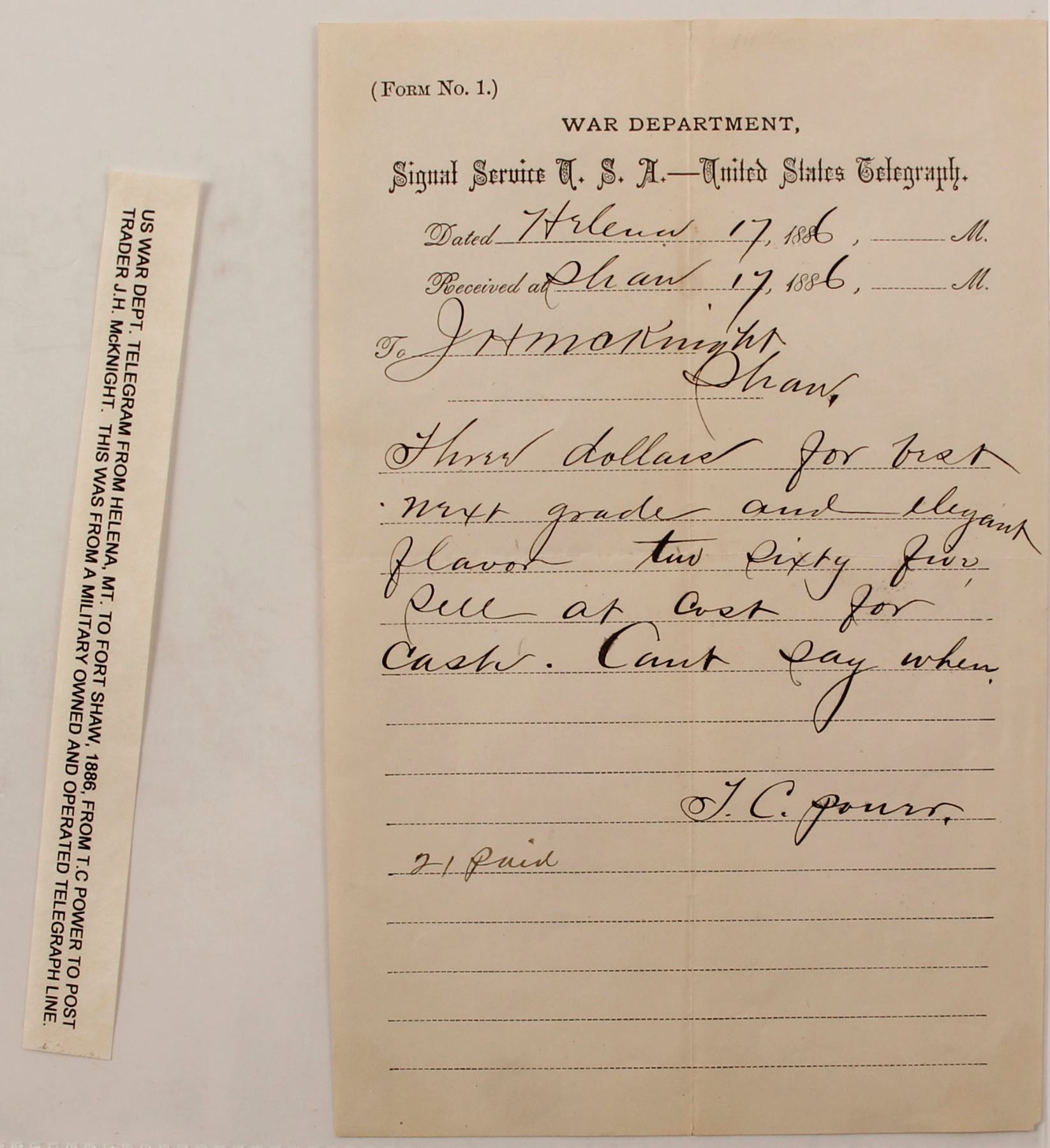 War Department, United States Telegraph message sent by TC Power, Helena, Montana to JH McKnight at Fort Shaw in 1886. Message is regarding rate for something with "elegant flavor." 8 x 5" Power was a post trader at Fort Benton and McKnight was a post trader at Fort Shaw. Power was also elected Montana's first senator. Date: 1886 City: Helena State: Montana HWAC# 67069