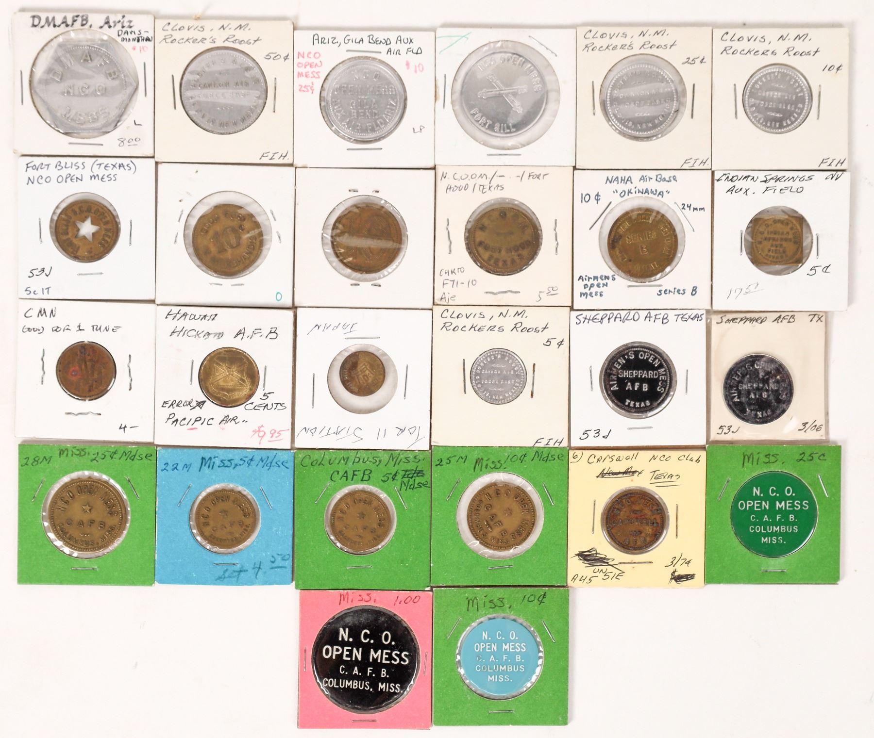 Lot of 26 military tokens: NCO open mess Columbus, MS (6); Rockers Roost, Clovis NM (4); Sheppard AFB TX (2); Fort Sill; Hickam AFB; Naha NCO Okinawa; Fort Hood; Fort Bliss; Indian Springs; Gila Bend Air Field.
