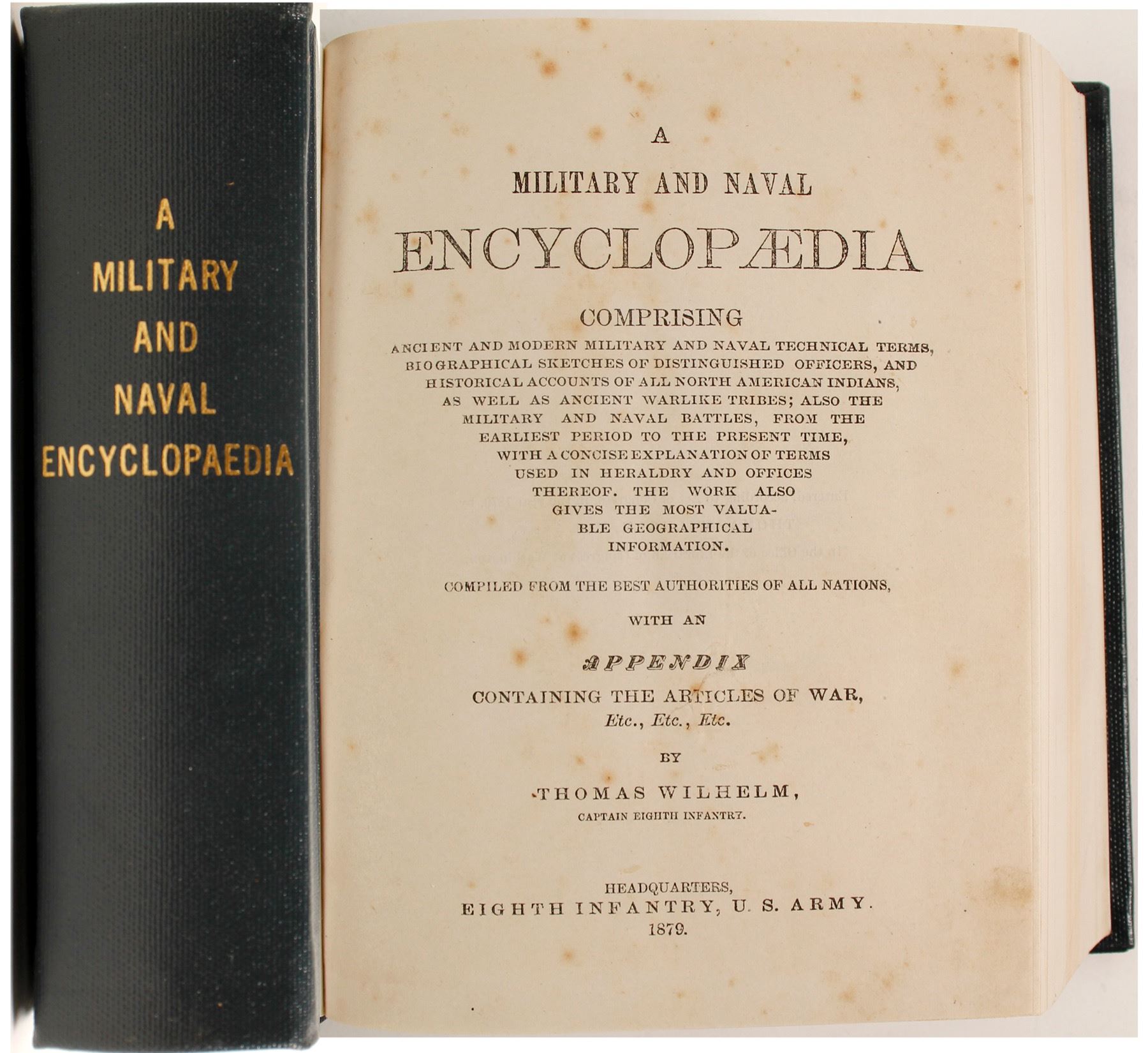 "A Military and Naval Encyclopaedia comprising ancient and modern military and naval technical terms, biographical sketches of distinguished officers, and historical accounts of all North American Indians, as well as ancient warlike tribes; also the military and naval battles, from the earliest period to the present time, with a concise explanation of terms used in heraldry and offices thereof. The work also gives the most valuable geographical information. With an appendix containing the articles of war, Etc., Etc, Etc." by Thomas Wilhelm, captain eighth infantry. Published by Eighth Infantry, U.S. Army in 1879. All of that is just the printing on the inside cover, so you can appreciate the detail packed in this 1,885-page volume. It appears to have been re-bound, and the interior pages are in excellent condition. State: City: Date: 1879