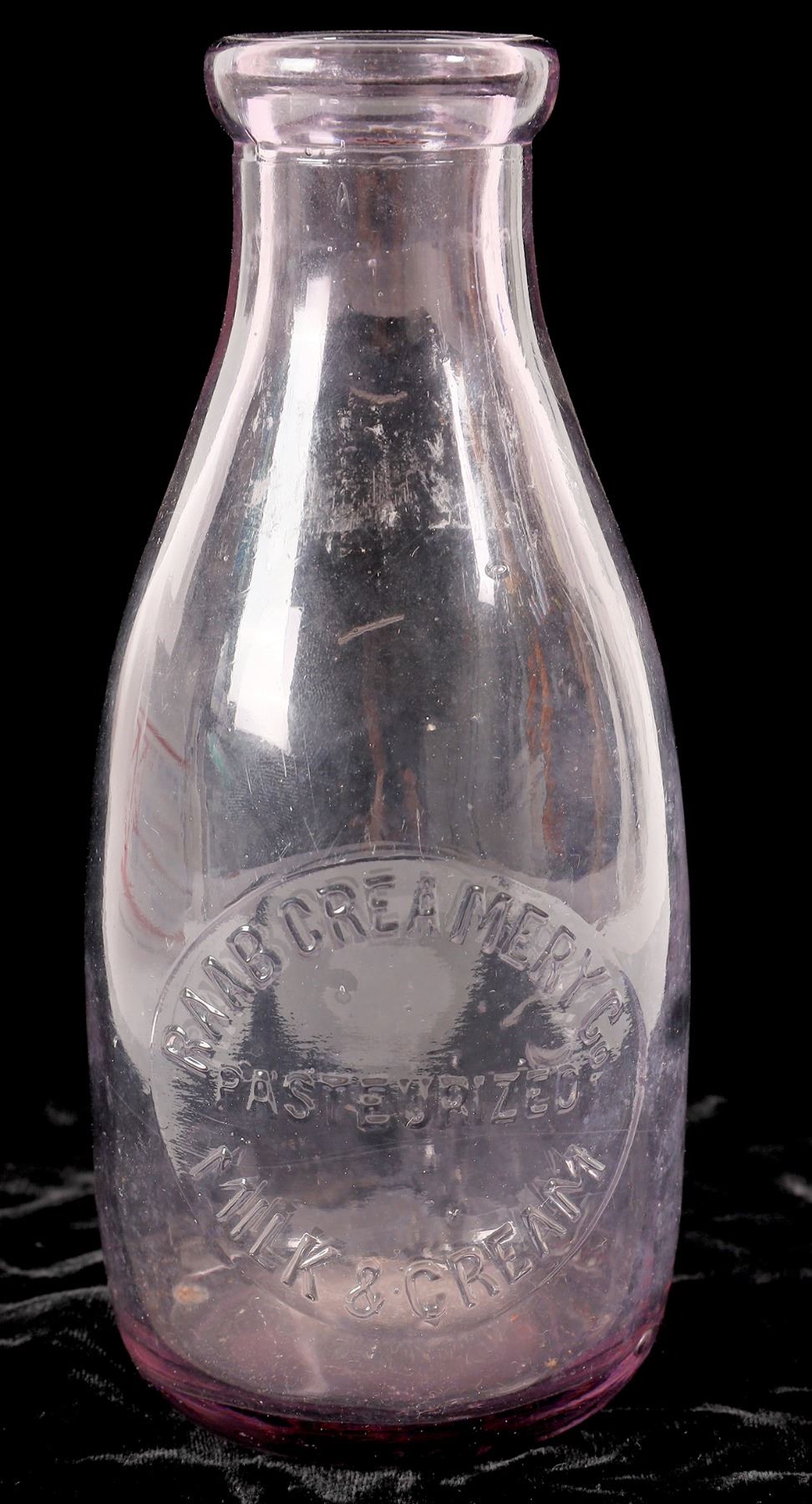 Very rare clear quart Raab Creamery/Pasteurized/Milk and Cream. Dairy located in South Pasadena. No apparent chips or cracks. California South Pasadena Fred Holabird Collection