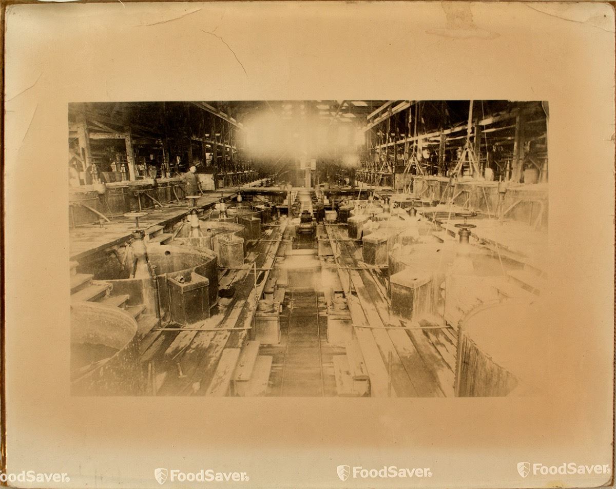 Possibly the California Pan Mill. The development of the milling process was one of the greatest expressions of nineteenth-century industrial, technological achievement on the Comstock. The California Pan Mill down hill from Virginia City, featured banks of vats capable of processing several tons of ore a day using the Washoe Pan Process developed in the early 1860s. City: Virginia City State: Nevada Date: hwac# 35354