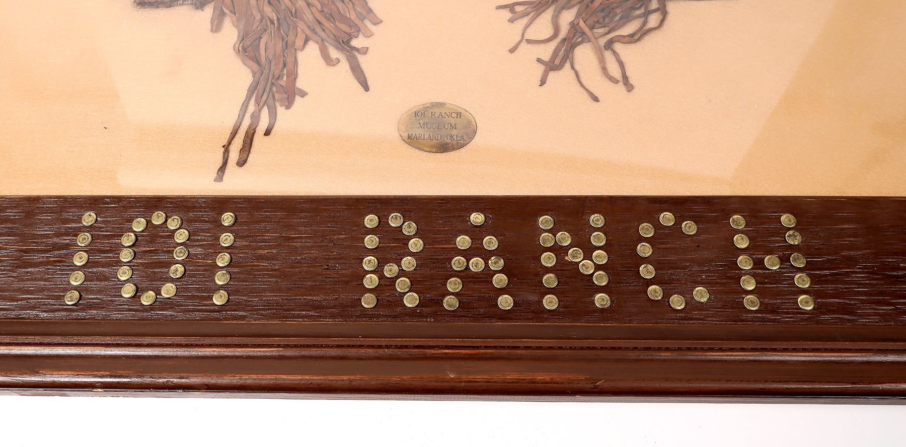 This belt has been wonderfully preserved in the original frame, and is in very good condition. Inside the frame is an original oval bras identification tag "101 Ranch/ Museum/ Marland, OK" The frame is also in very good condition, with only a few scratches around the edges. Overall size is 31 x 53.5 inches. This piece is one of the most personally prized of the Bracken collection. Oklahoma Gary Bracken Collection