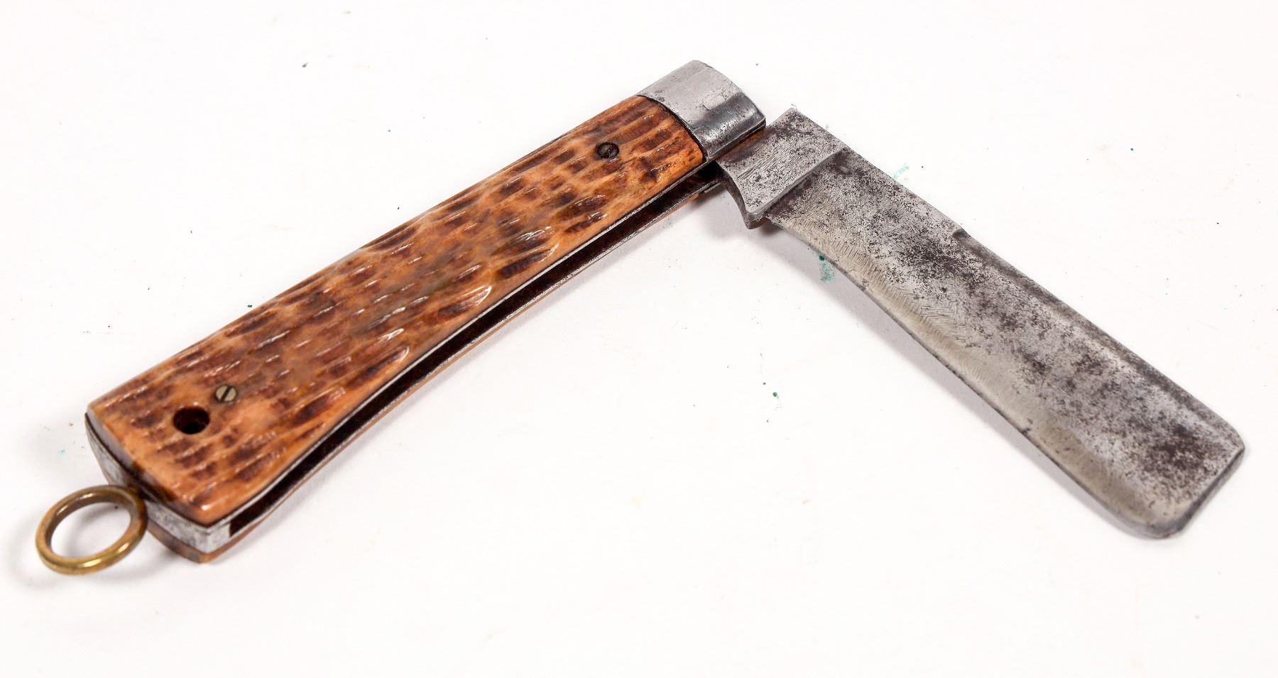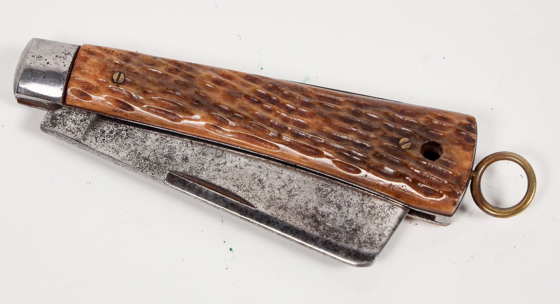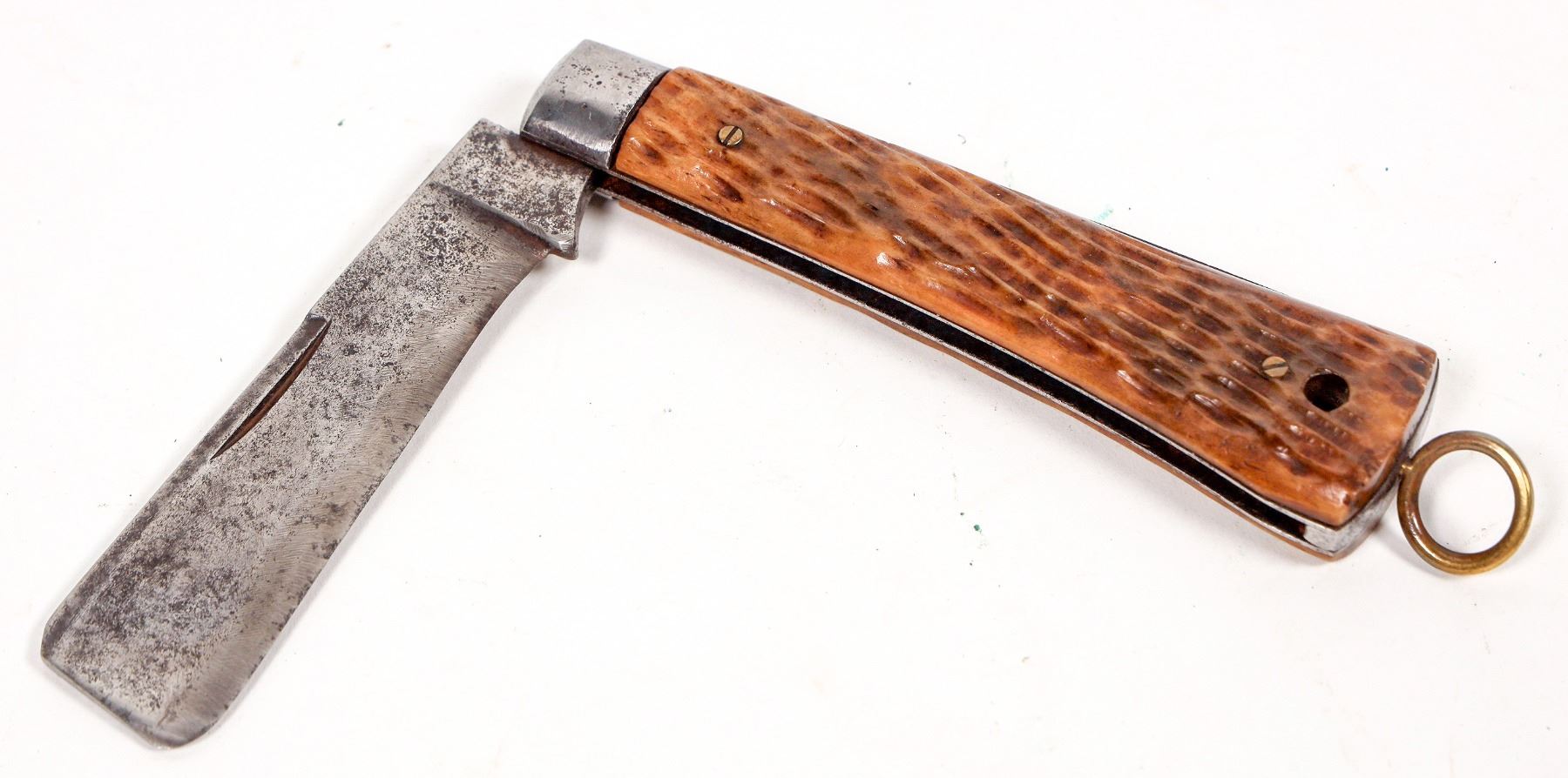 This folding knife is marked "xxxLER/ BROS" (Miller Bros) on the ricossa barely visible on a cleaver blade; known as a "rope knife". At 4.75 in. closed and 8.50 in. open. The scales are honey colored, jigged with brass screw mounting. The scales show slight shrinkage, and a lanyard hole. There is a brass lanyard ring that appears to be original mounting out the back. The blade is in good condition with a nail nick and false edge on top. c. 1863-1926. A rare find. In good condition. Please see photos for details.