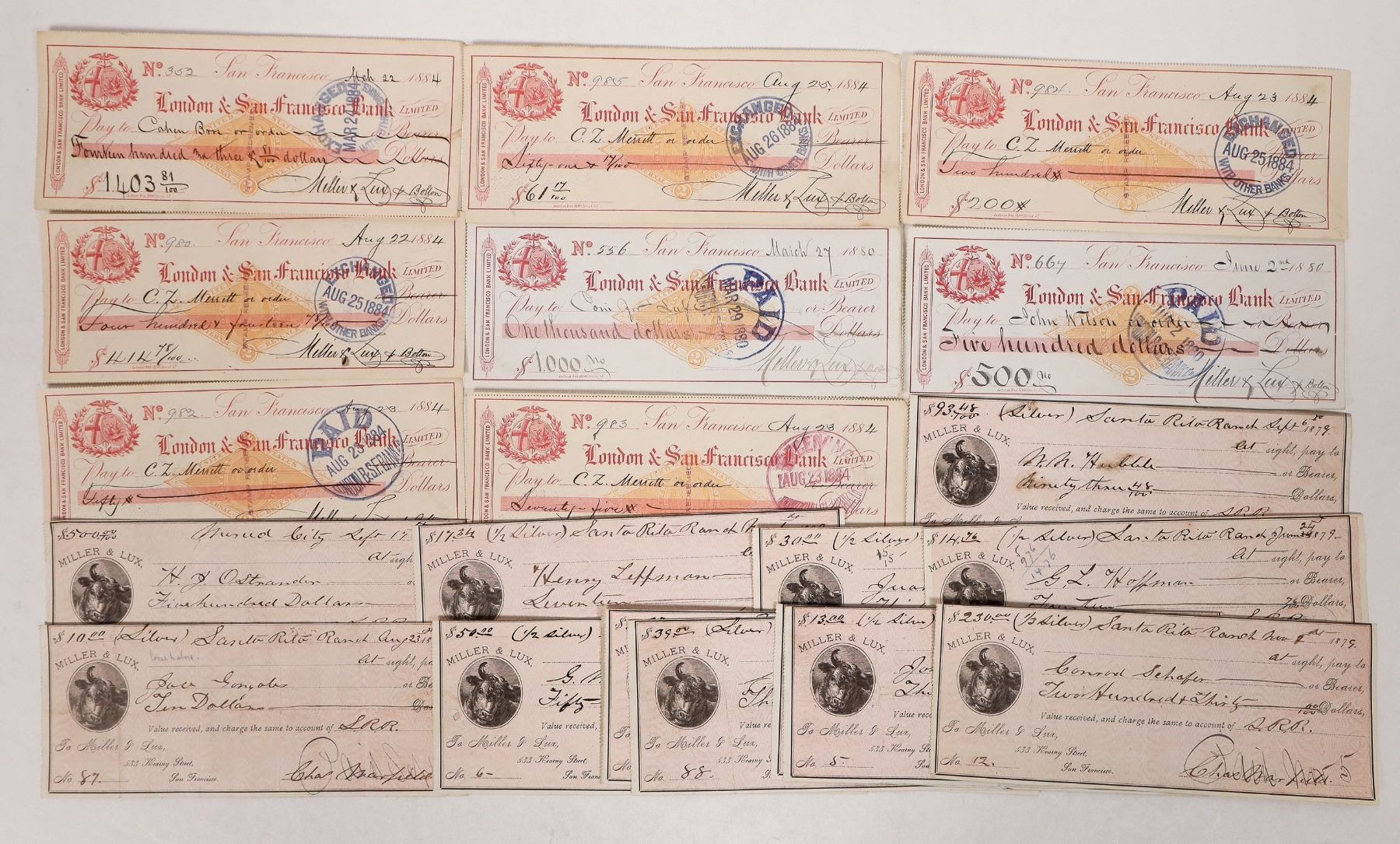 Checks (19) written by and to Miller & Lux cattle ranchers of the largest spreads in California in the late 1870s to 80s.There are checks written on the London & San Francisco Bank.