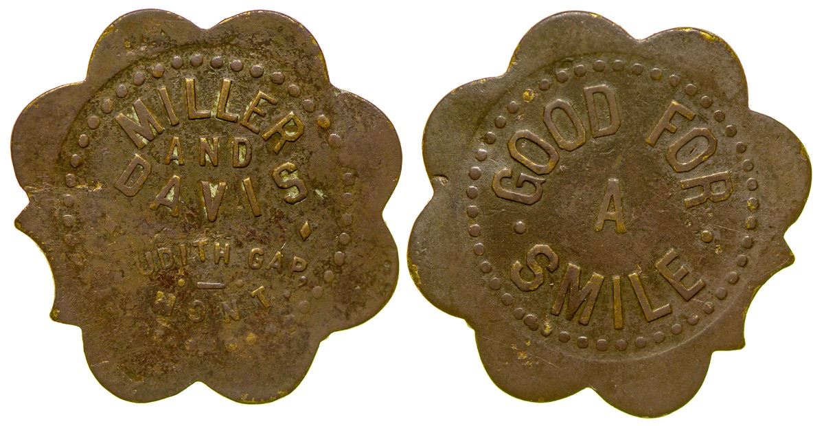 R-8. Miller / And / Davis / Judith Gap / Mont. // GF / Smile. Scalloped (8), (one scallop clipped off), brass, 29mm. (Svoboda Collection) City: Judith Gap State: Montana Date: HWAC# 35063