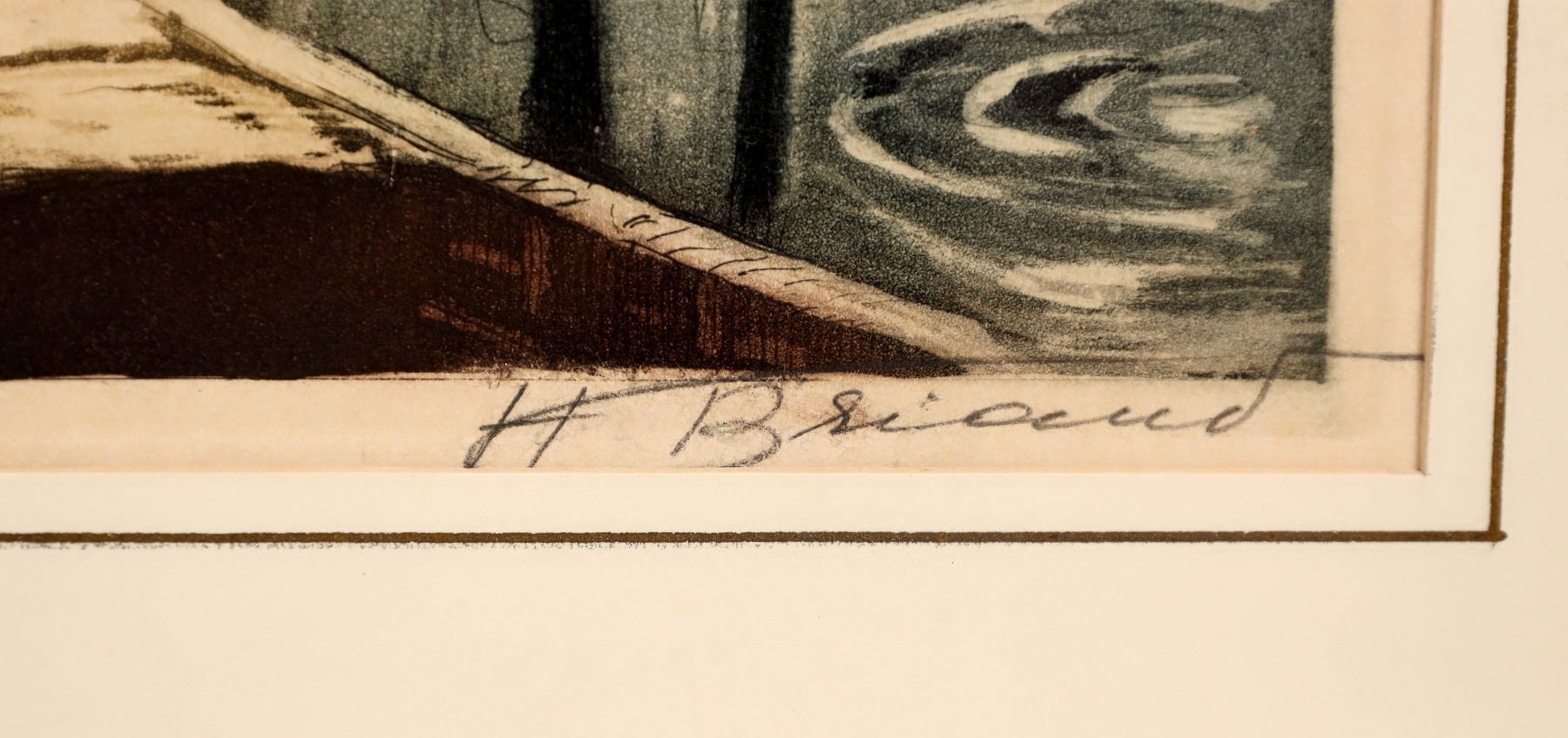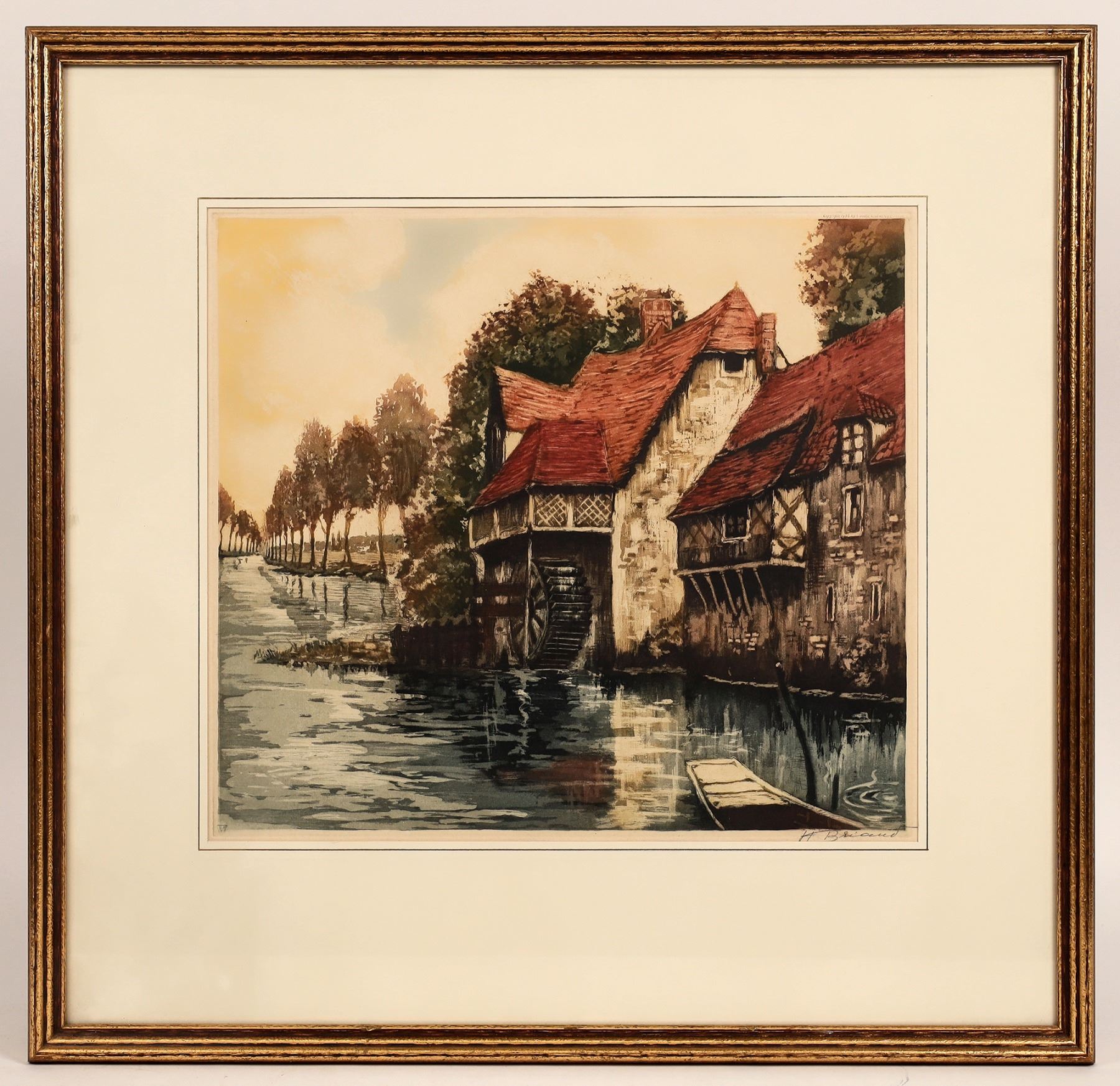 Framed, matted drawing of a riverside millhouse with a waterwheel. Artist signature illegible. Frame is 21 x 20 inches.