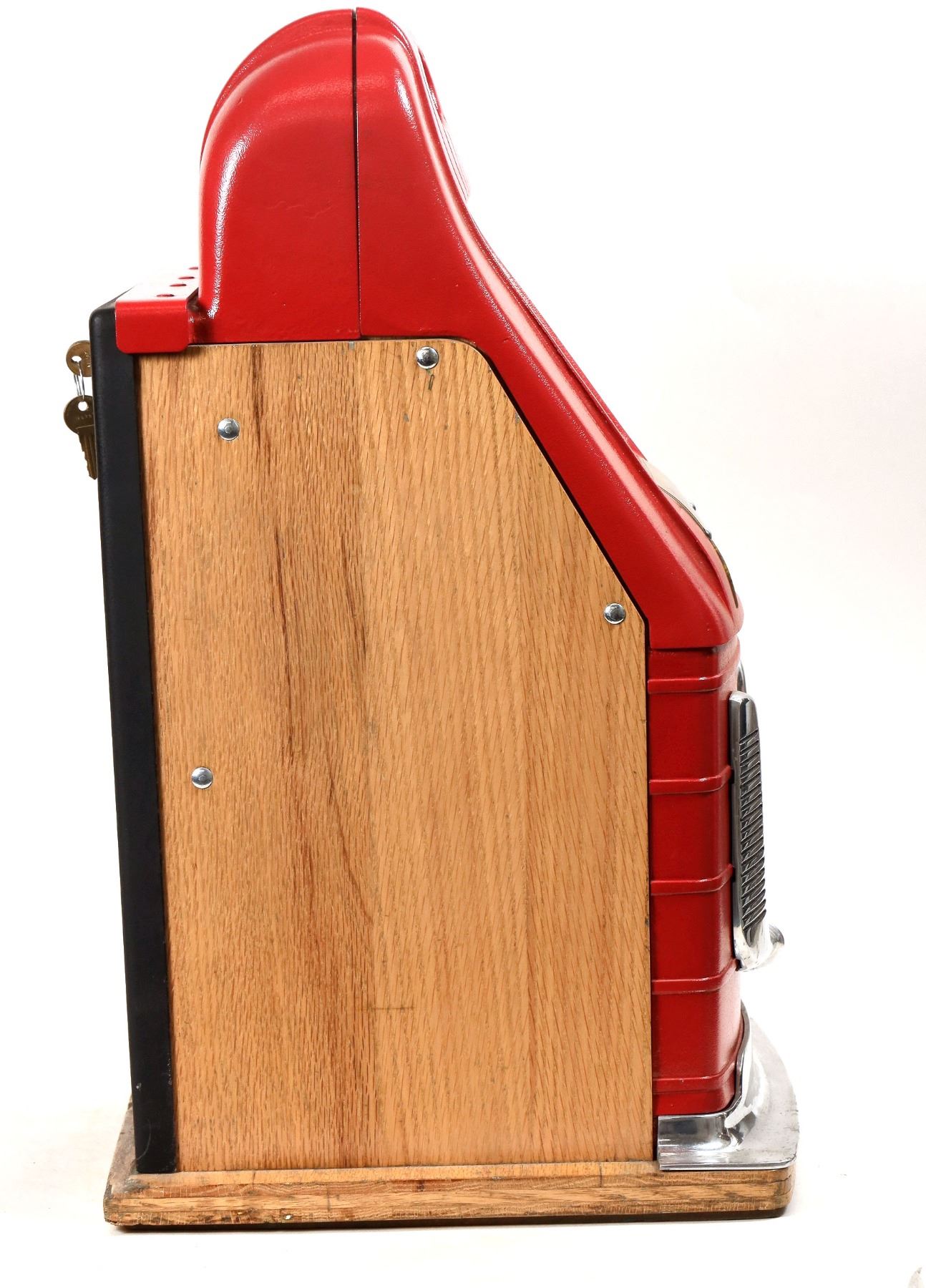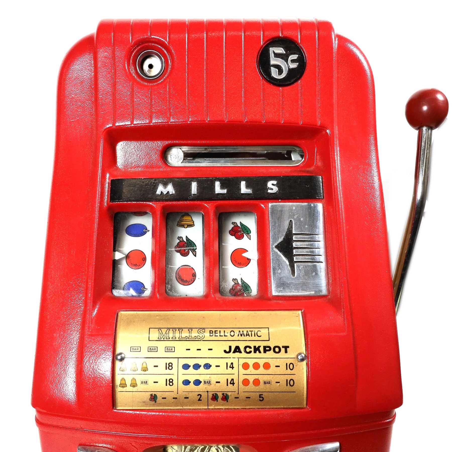 Circa 1950 bright red metal case, wooden sided, three reel Mills nickel slot machine, wooden base, "A C E" in clubs is the jackpot. Height: 26 inches; Width: 16 inches; Depth: 16 inches. With two keys, and no cash box. Typed instructions to the owner inside back cover, probably written by Dick Graves, telling the owner how to make more money. Graves was a slot salesmen and operator from Boise Idaho who moved to Nevada in 1954 when he purchased the Carson City Nugget casino, when Idaho outlawed gambling. The Ascuaga family purchased the Sparks Nugget from Graves in 1960 and this machine along with others were passed along through the family over time. This machine is being sold on behalf of Michonne Ascuaga. Reels spin lazily when a coin is inserted, might need adjusting. We lost ten cents so far.