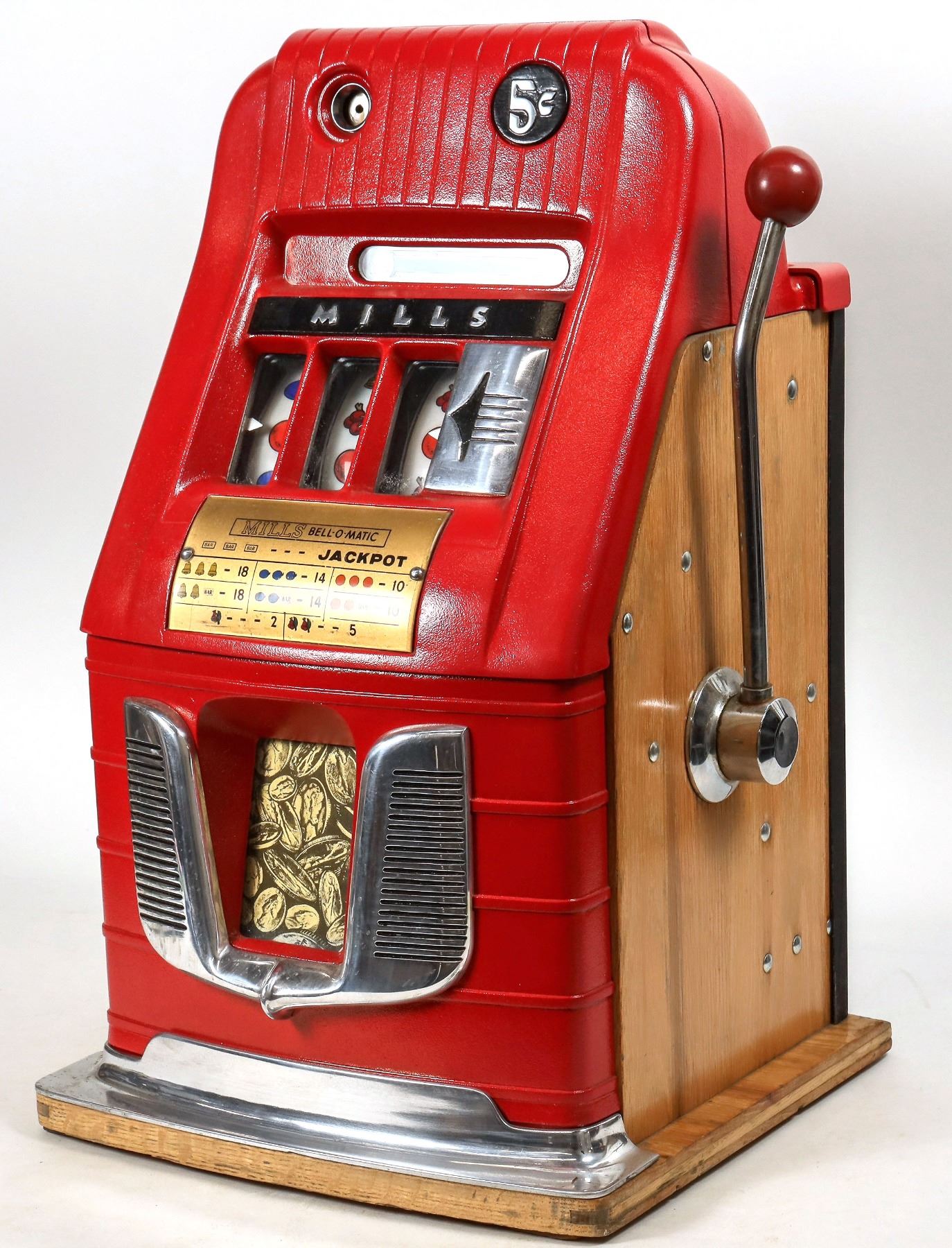 Circa 1950 bright red metal case, wooden sided, three reel Mills nickel slot machine, wooden base, "A C E" in clubs is the jackpot. Height: 26 inches; Width: 16 inches; Depth: 16 inches. With two keys, and no cash box. Typed instructions to the owner inside back cover, probably written by Dick Graves, telling the owner how to make more money. Graves was a slot salesmen and operator from Boise Idaho who moved to Nevada in 1954 when he purchased the Carson City Nugget casino, when Idaho outlawed gambling. The Ascuaga family purchased the Sparks Nugget from Graves in 1960 and this machine along with others were passed along through the family over time. This machine is being sold on behalf of Michonne Ascuaga. Reels spin lazily when a coin is inserted, might need adjusting. We lost ten cents so far.