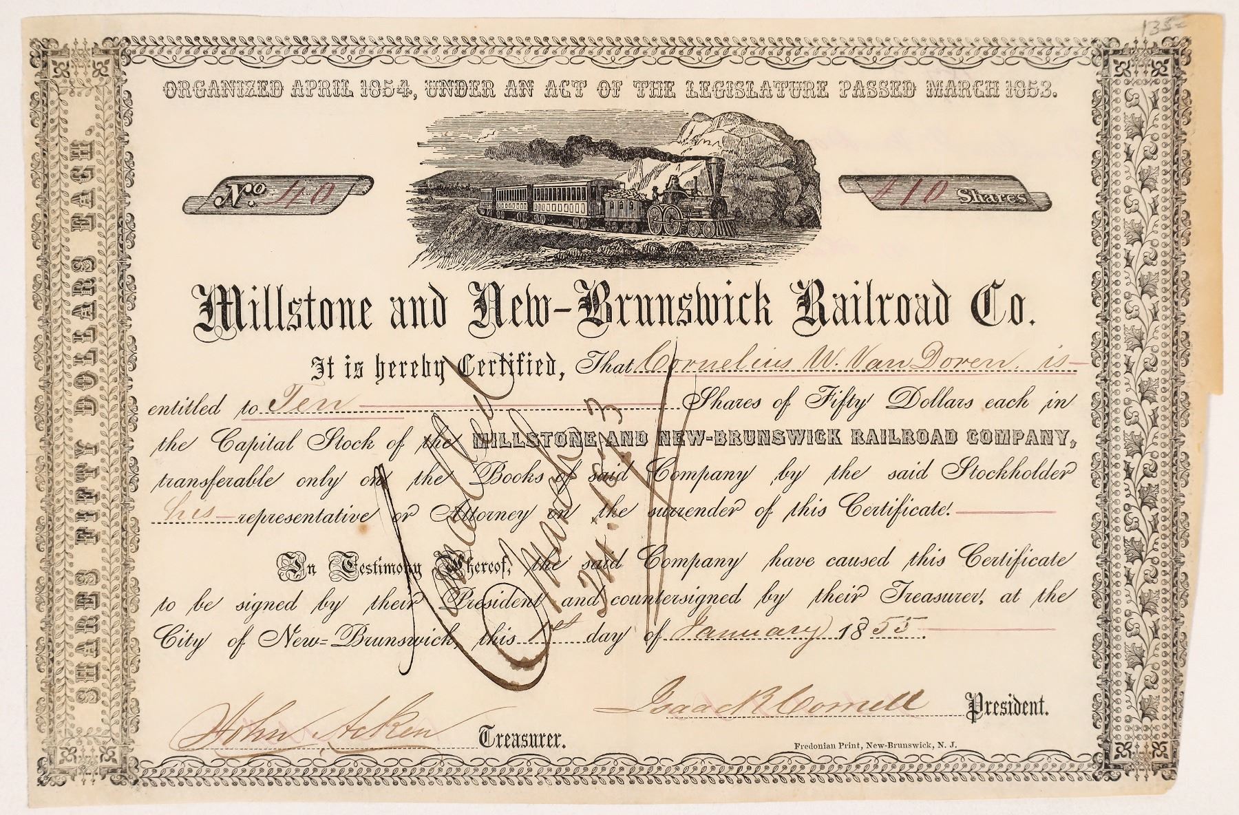 Organized April 1854, Under an Act of the Legislature Passed March 1853. No. 40, issued for 10 shares to Cornelius W. Van Doren in January 1855. Signed by president Isaac Cornell and treasurer John Acken. Pen cancelled. Ornate border and locomotive vignette. Printed on thin paper. 6.5 x 9.5" Rough right edge. This was a seven-mile long branch line from New Brunswick, New Jersey to East Millstone, New Jersey. Construction was completed and the line began operation on December 19, 1854. In 1871, they signed a 999-year lease with the United Jersey Railroad Company, which would later become part of the Pennsylvania Railroad (PRR) known as the "Millstone Branch." In 1915, the company was dissolved and became part of the United Jersey Railroad Company.
