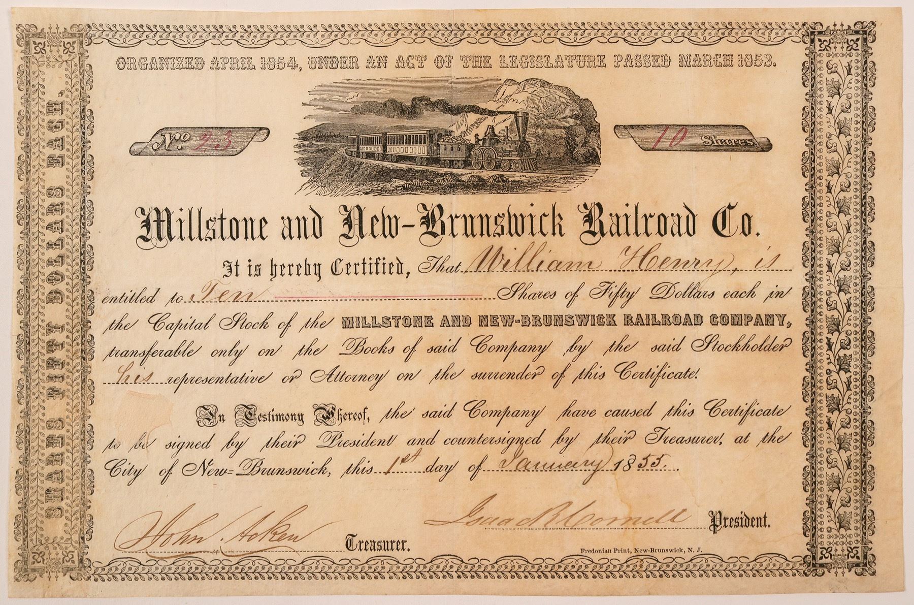 I/U, #23 for 10 shares of common stock @$50 par issued Jan 1, 1855. Signed J.B. Connell President. Black, vignette open cab loco r-l around curve, no printer identified. Only 200 are known to exist.