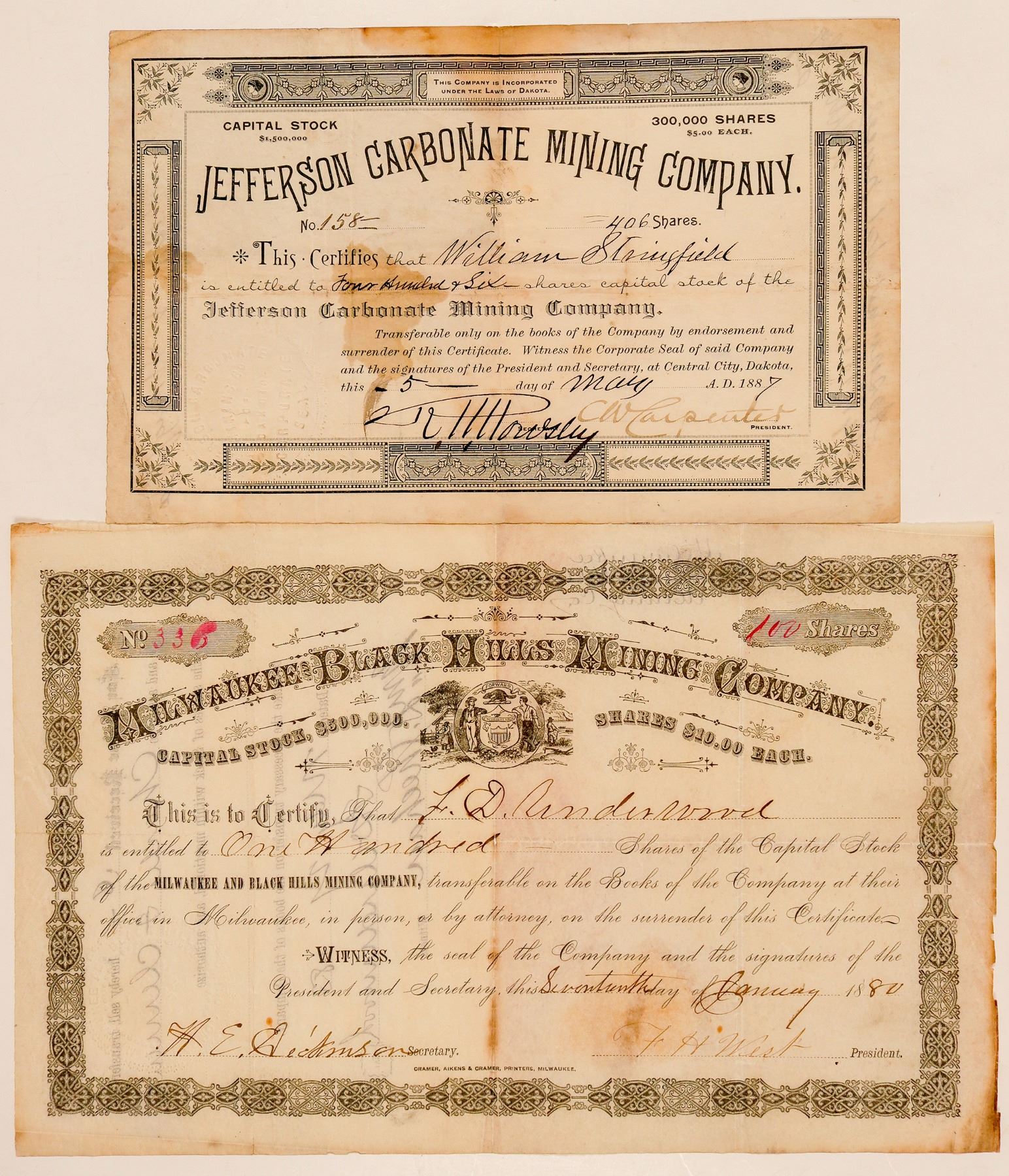 No. 336, issued for 100 shares to L.D. Underwood on January 17th, 1880. Signed by president FH West and secretary H.E. Dickinson. Not cancelled. Black border and print, ornate title and small allegorical vignette. Printed by Cramer, Aikens & Cramer, Milwaukee. Deep horizontal and vertical folds, heavy staining most evident on the reverse, rough edges. 7 x 10.75" Mining claim located on the Snowstorm Lode in 1877. Office in Deadwood. The Snowstorm Mine was on top of Green Mountain. In 1880, the company had a 20-stamp mill in Nevada Gulch. [Ref:E&MJ Vol. 30, pg 107] () Ken Prag Collection