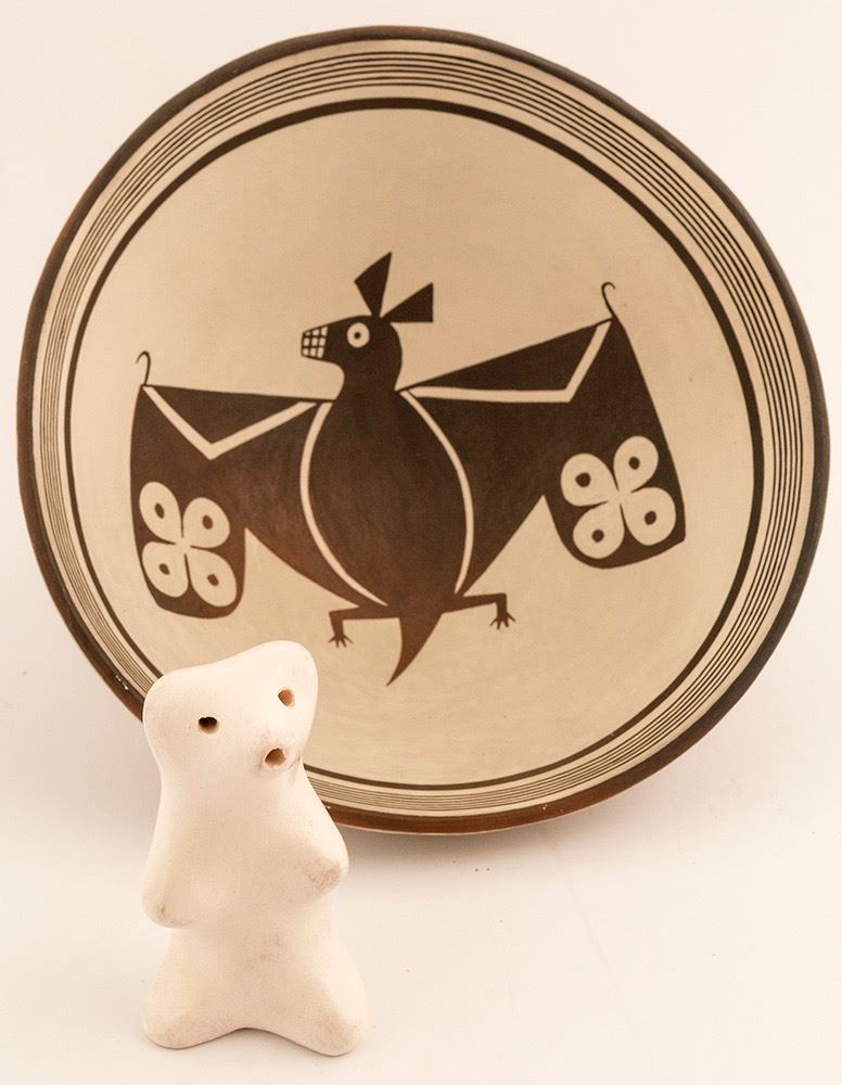 Mimbres "Bat" replica bowl, by Thornburg. 3" h x 7.25" diameter. Since 1987 Paul & Laurel Thornburg have been making museum quality replicas of prehistoric Southwestern ceramics. Their specialty is accurately made custom private orders of 1000 year old Mimbres bowl designs using wild clays and pigments with wood firings. For over 20 years the Thornburg's work has been shown at the museum shops of the Arizona State Museum, at the University of Arizona in Tucson, as well as at Western New Mexico University Museum in Silver City--this bowl is from WNMUM. Also included in this lot is a small white bear figurine (3" x 2") by Andrew Padilla is from the Laguna Pueblo and the Santa Clara Pueblo. He was inspired to learn the art of working with clay from his grandmother, Reycita Padilla. She taught him all the fundamentals to hand coil Santa Clara pottery. When he moved to the Laguna Pueblo, he began experimenting with white clay. His mother, Gladys Paquin taught him where to find the best clay. Andrew combined his Santa Clara and Laguna cultures to create his elegant contemporary style of art. Date: Location: Sonoita, Arizona HWAC # 49353