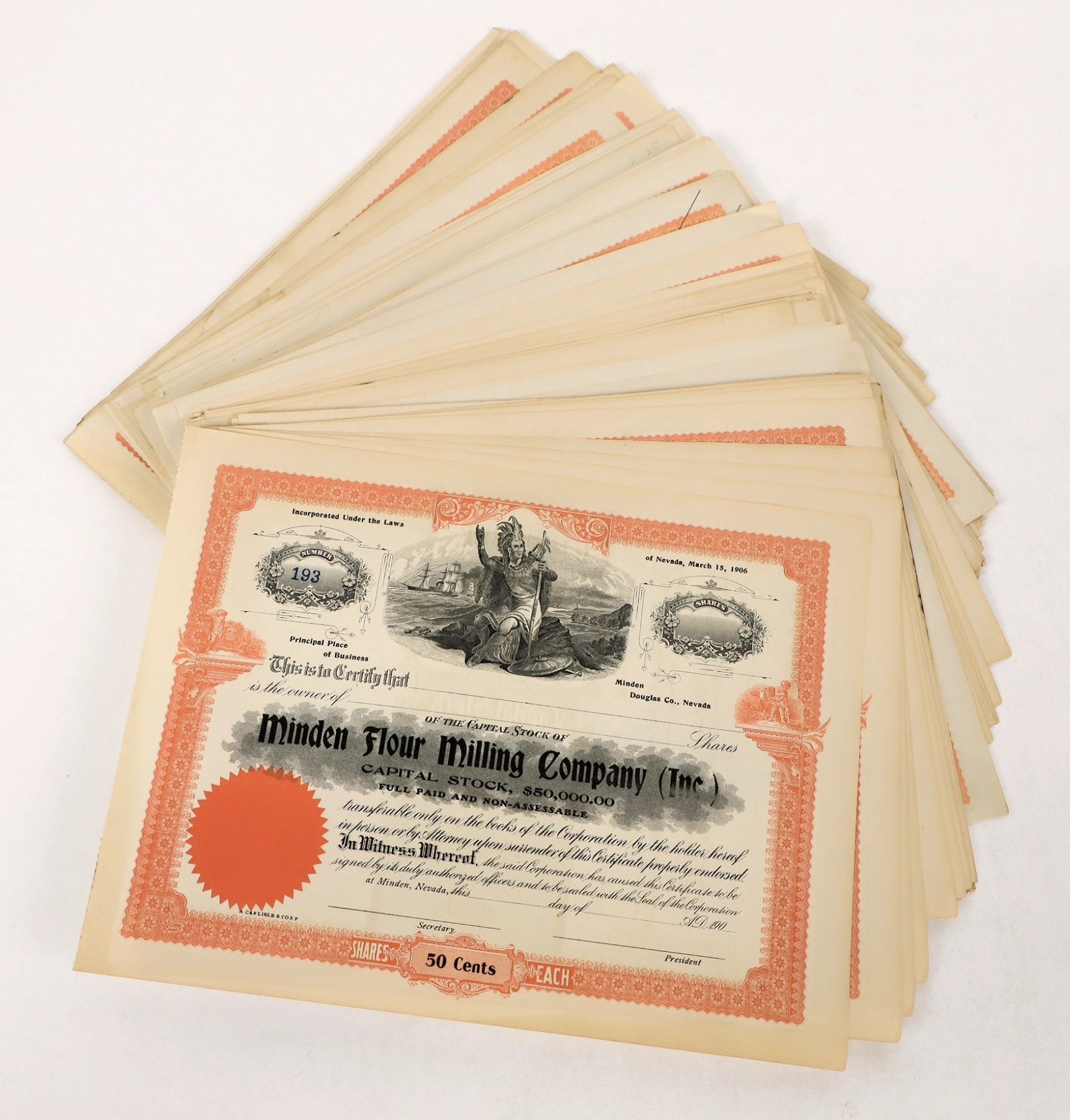 There are over 110 stock certificates for the Minden Flour Mill Company of Minden, Nevada. There are signatures from H.F. Dangberg, H.F. Dangberg Jr., J.B. Dangberg, and one stock issued to Anna Dressler in 1940. All are respected names in Nevada history. Please see photos for details.