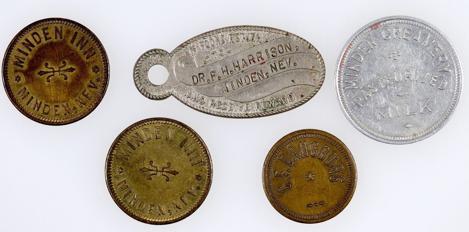 Lot of five tokens from the Douglas County town of Minden. 1) C.F. DANGBURG // GOOD FOR / 5 / CENTS / IN TRADE; Br. rd., 21 mm. 2) MINDEN CREAMERY / PASTEURIZED / MILK // GOOD FOR / QUART / OF / MILK; Al., rd., 29 mm. 3 & 4) (two the same) MINDEN INN / MINDEN, NEV. // GOOD FOR / 25¢ / IN TRADE; Br., rd., 24 mm. 5) I.D. Tag: If Found return / to / Dr. F. H. Harrison / Minden, Nev. / And Receive Reward. Wm, oval, 42 x 20 mm. (Dr. Harrison is in the 1919 directory).