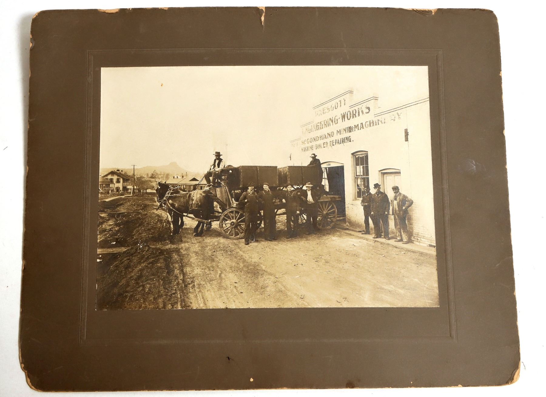 Original mounted photo of the Prescott engineering works factory about 1900. The photo shows a two horse drawn wagon with two large recently manufactured ore cars about to be delivered. The matting is 13.5 x 11", the actual photograph size is 9.5 x 7". Condition fine plus, focus good, contrast medium. No photographer shown. This is a great photograph showing a couple of newly manufactured ore cars probably headed to one of the local gold mines near Prescott. I don't recall us having any paperwork from this or car manufacturer before. [ Prescott Arizona