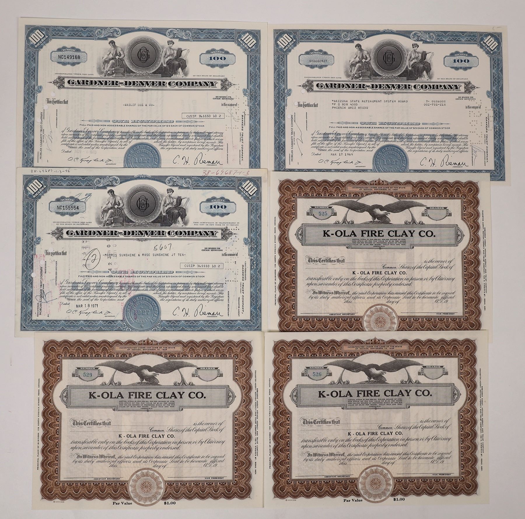 Lot of 6. 1) K-Ola Fire Clay Company. Inc. in Nevada, 1929. Three unissued stocks. 2) Gardner-Denver Company. Three stocks issued 1969-1971. Allegorical vignette.