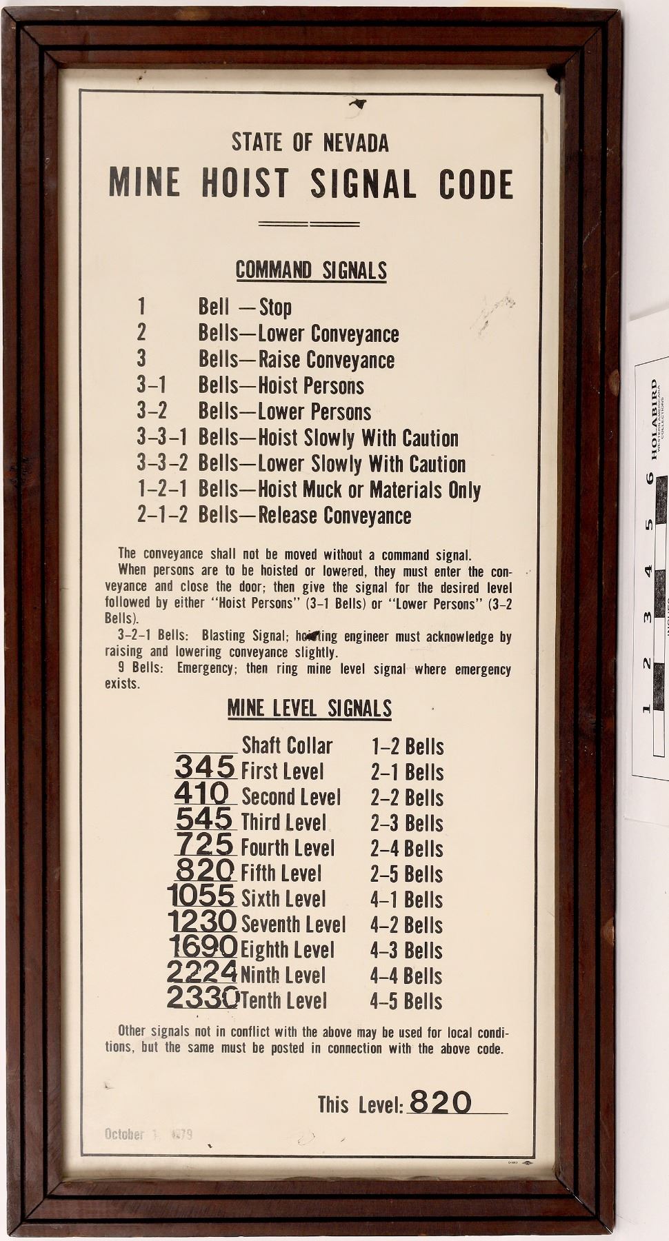 A State of Nevada mine hoist signal code poster in its original frame with the mine level number and date. This poster, originally kept on level 820, has the date "October 1, 1979" printed in the bottom left corner. Frame is made of dark wood and has very minor damage. Dimensions of frame are 13-7/8 x 27-1/2 inches. Poster dimensions are 11-6/16 x 24-7/8 inches.