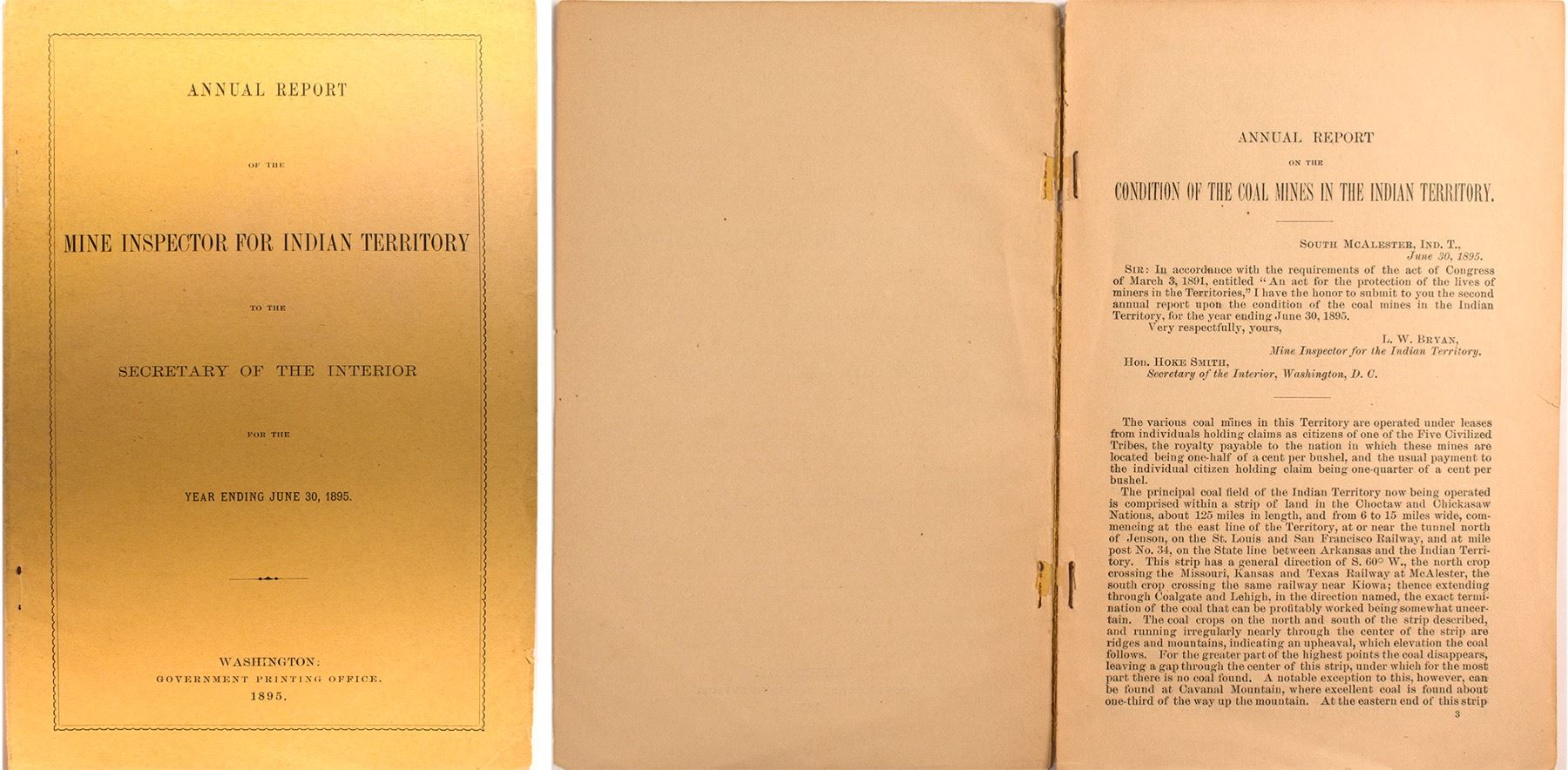 Printed by the Government Printing office for the year ending June 30, 1895, this report was prepared for the Secretary of the Interior. 24 pages of text deals with the coal mines of the five civilized tribes in Indian Territory. This is present day Oklahoma. The binding is split about 2î at the top and bottom of spine. Soft back covers. Companies operating the coal mines mentioned include Cavanal Coal and Mining Company, Kansas and Texas Coal Company and the Osage Coal and Mining Company. Date 1895 Indian Territory, OK City: State: Oklahoma Date: HWAC# 51204