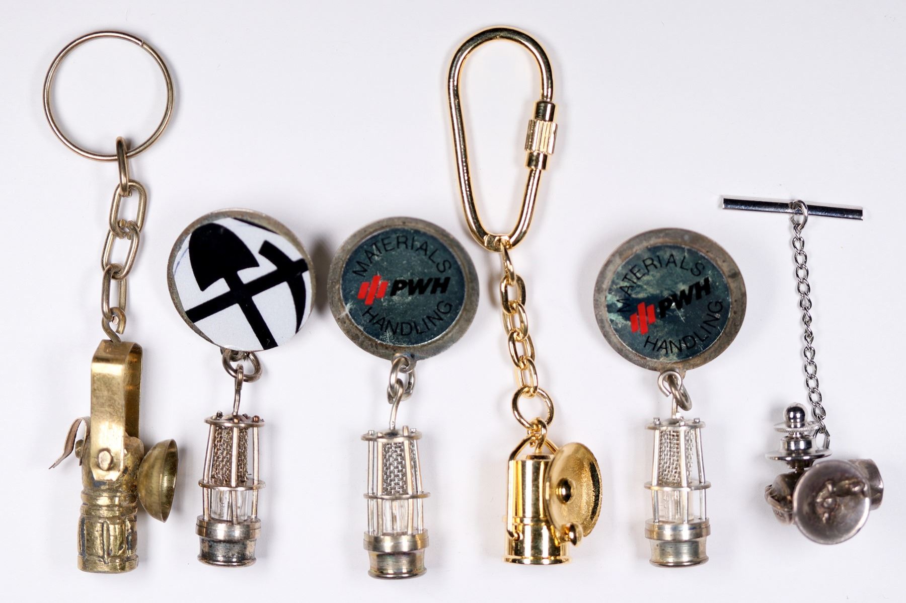 Six pieces of jewelry in the shape of underground miners lamps: three lapel pins with dangling, one-inch mine safety lamps, two branded by PWH Material Handling; one tie tack pin with a miniature carbide lamp in Sterling silver; and two key fobs with a miniature brass versions of a carbide lamp, one with shiny brass finish, the other in antiqued finish. Wear your underground mining heritage with pride.