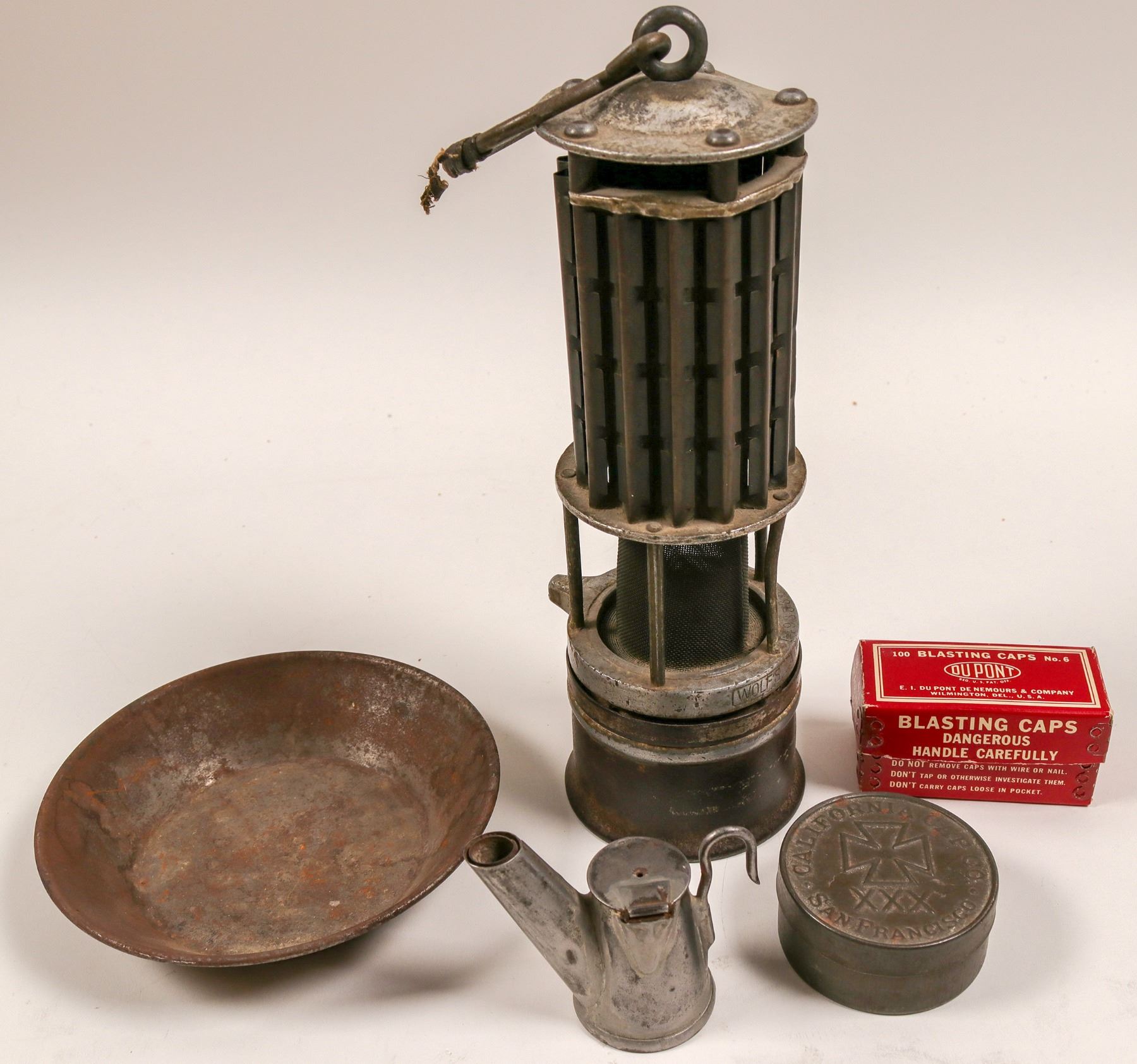 6.25" metal gold pan, California Cap tin and Dupont cardboard cap box. Nice Geo Anton oil wick lamp. Wolf safety lamp