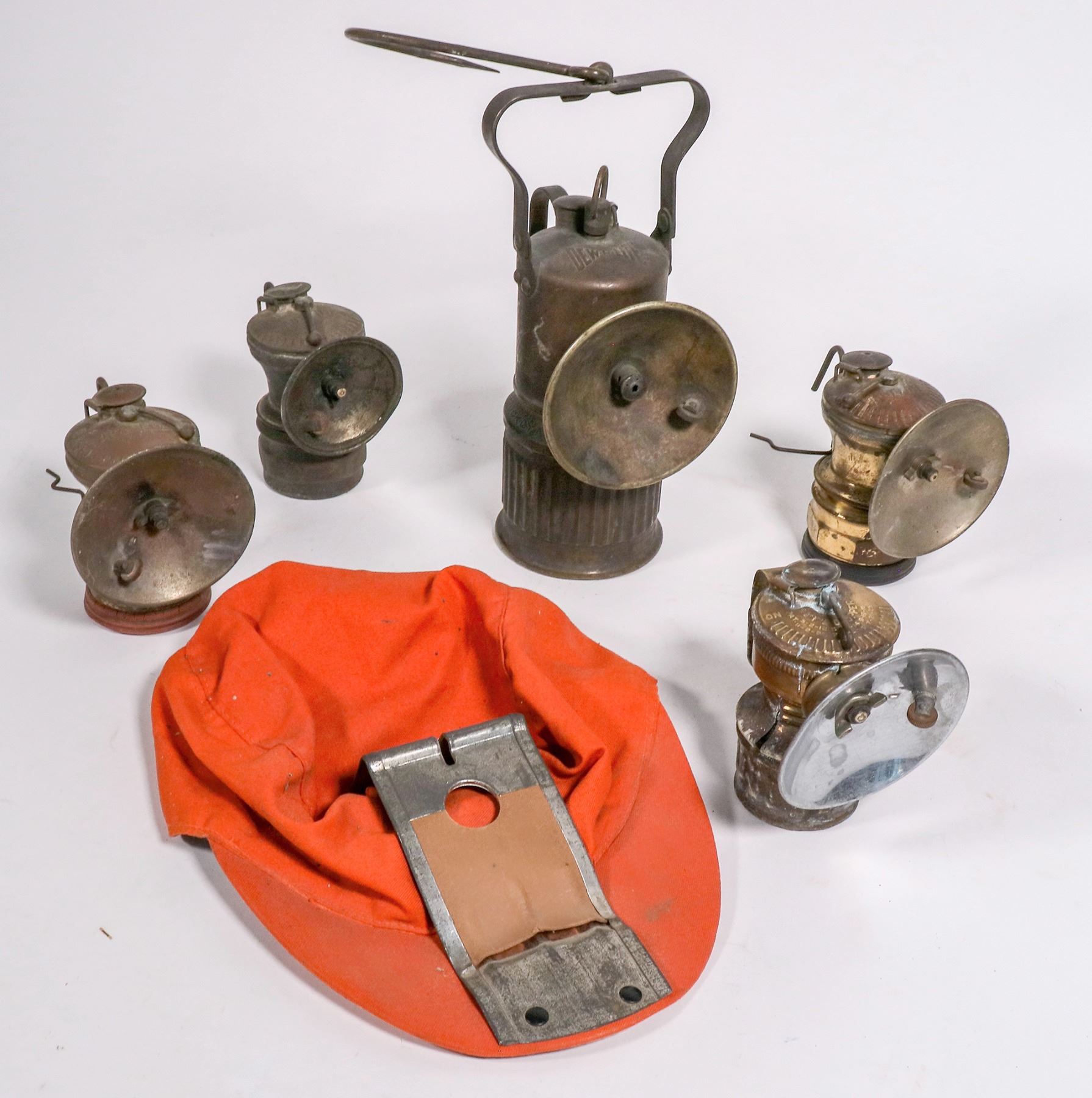 Orange cloth hat for carbide lamp and 5 carbide lamps, none for this hat. Dew.R.Lite, Guy's Dropper, 3x Auto Lite and a lamp repair kit.