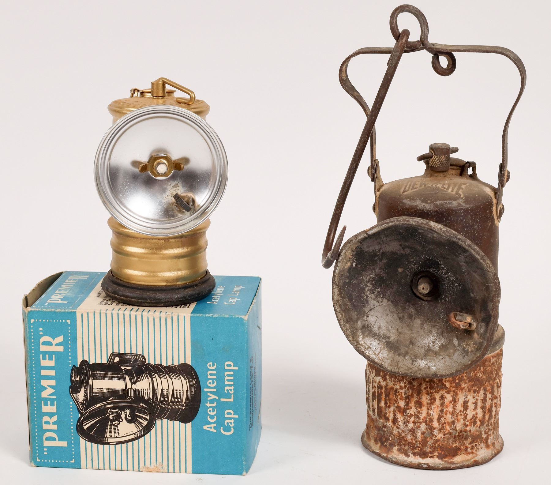Dew-R-Lite superintendent lamp, 6x3" plus handle, appears to be in dug condition. New in box Premier Acetylene Cap Lamp, box 5x3x4.5".