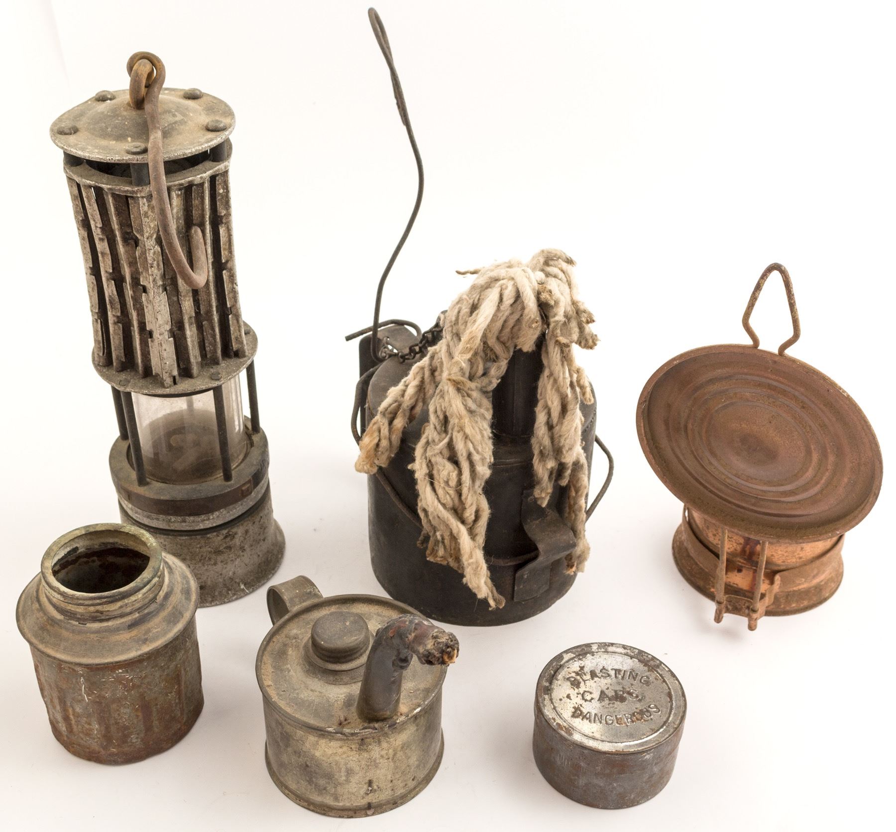 An eclectic collection of mine lighting equipment. Includes a mine safety lamp, blasting tin, carbide lamp base and an unusual oil wick lamp or two.