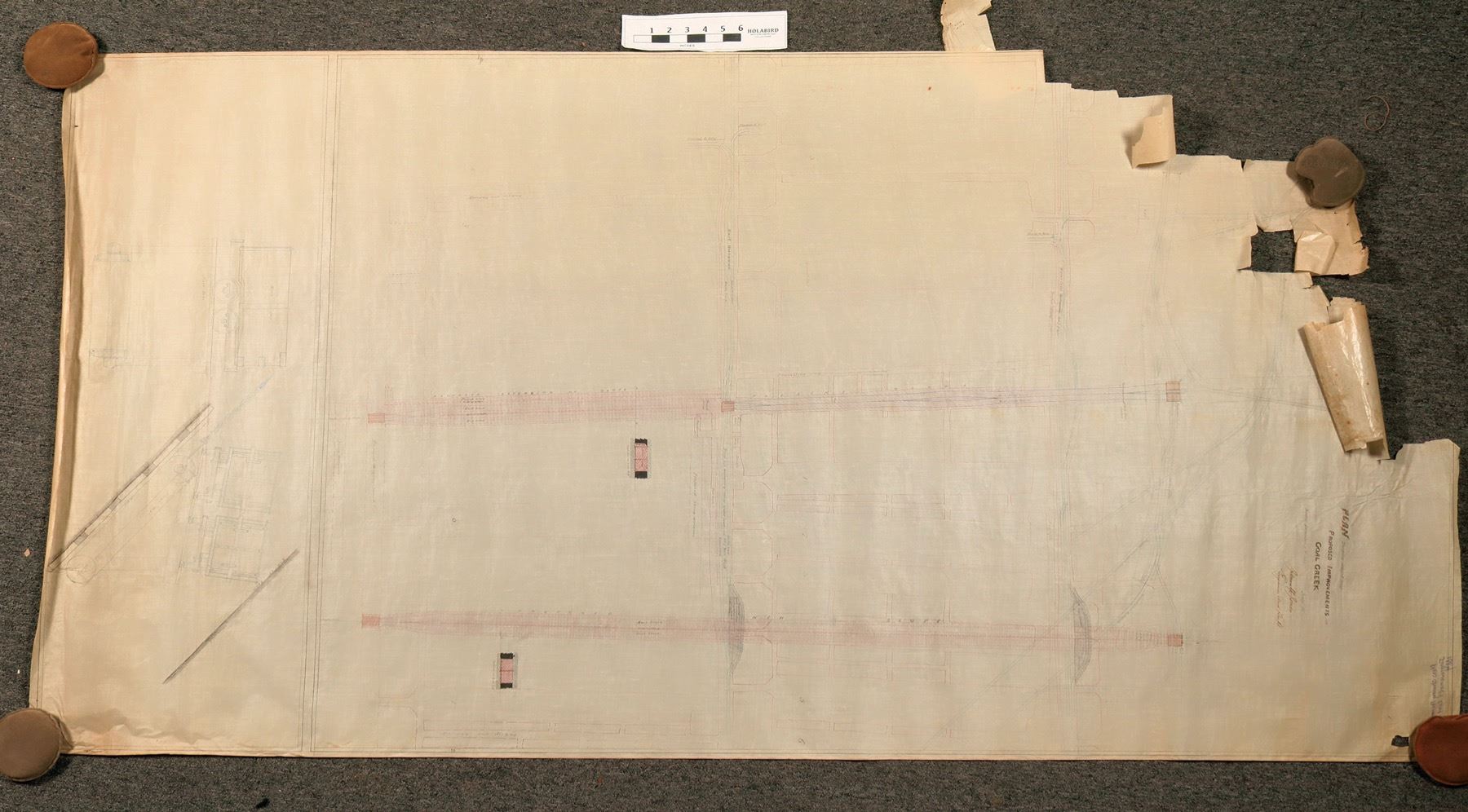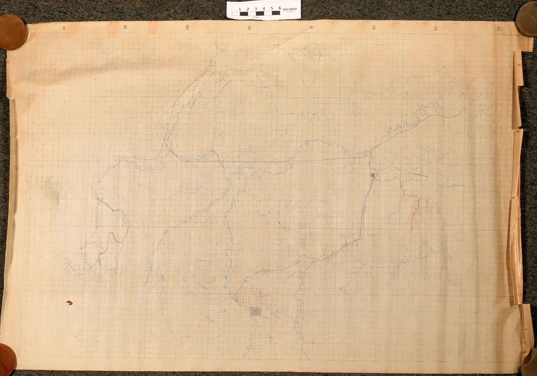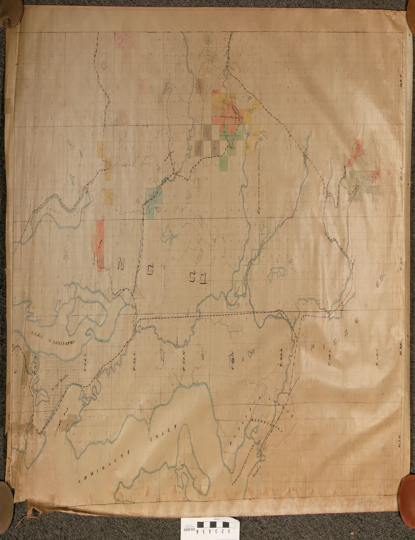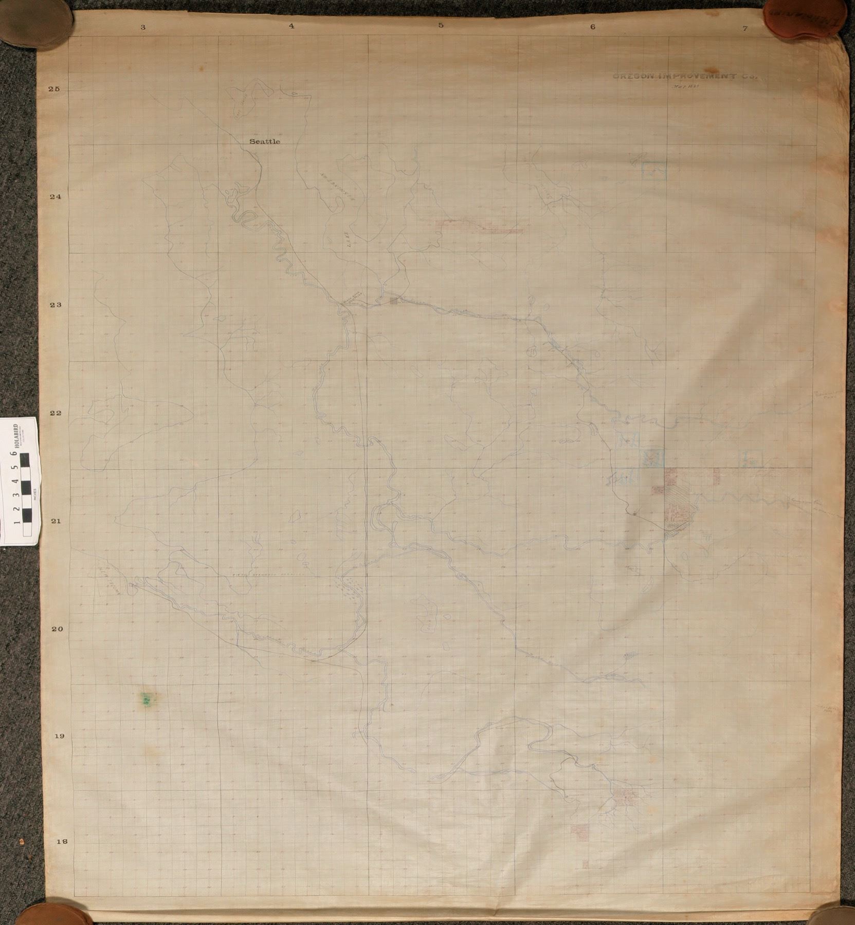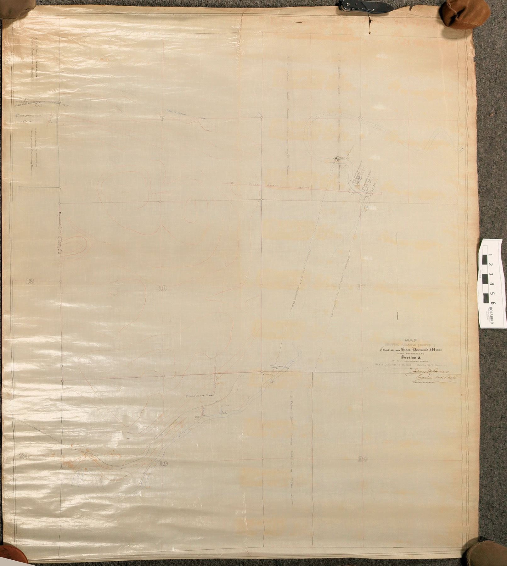 Group of five very large, appx 40" x 80" original black ink on linen maps. Most cover a very wide range from T18N to T25N (above Seattle), R3E to R7E (south of Renton). The maps were made by James f. Jones, Engineer and project Supt.for teh Oregon Improvement company. The key mine, subject of some maps, was the Coal Creek Mine. Others included the Franklin and Black Diamond mines and New Castle Field.. The Coal Creek material includes engineering drawings for custom ore cars. Varying scales, though the larger maps are generally 1"=1000ft. A couple are a bit ragged at top. The Oregon Improvement company was the brainchild of financiel Henry Villard, as part of his desire to "dominate economic developemnt of the Pacific Northwest", according to a summary of the company's holdings at the Univ. Of Washington Special Collections Library. The company ran from 1880-1896, developing coal mines and railroads.