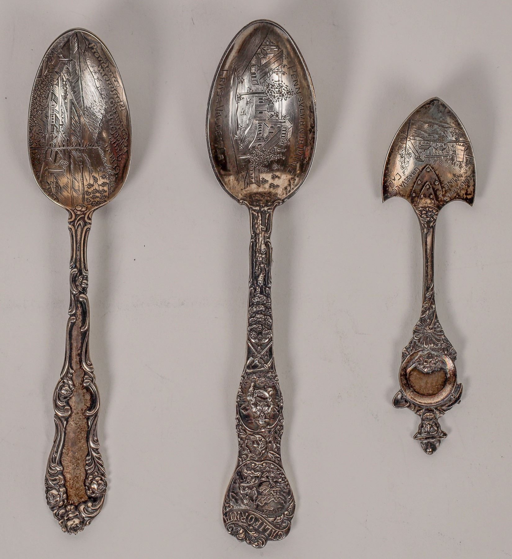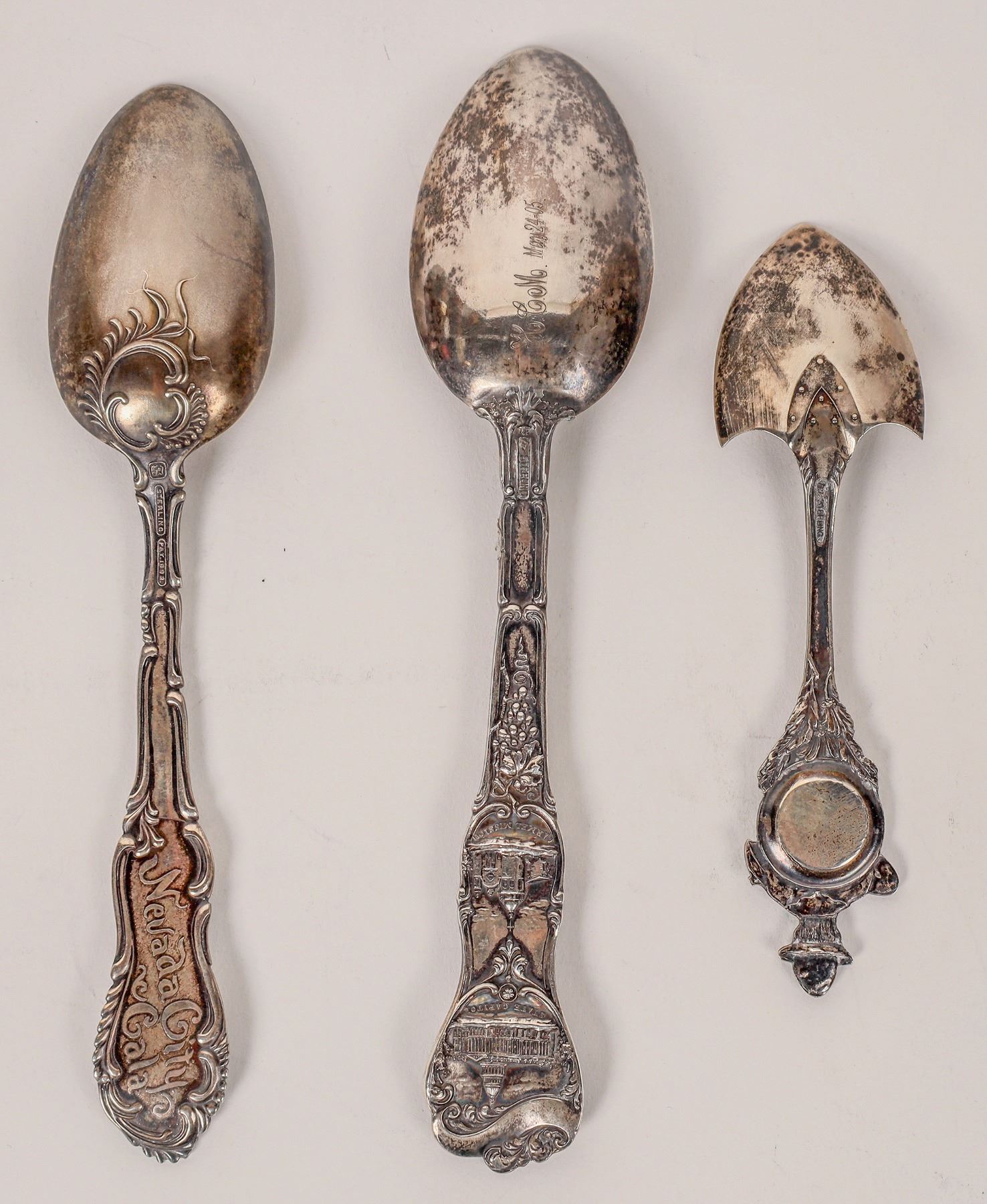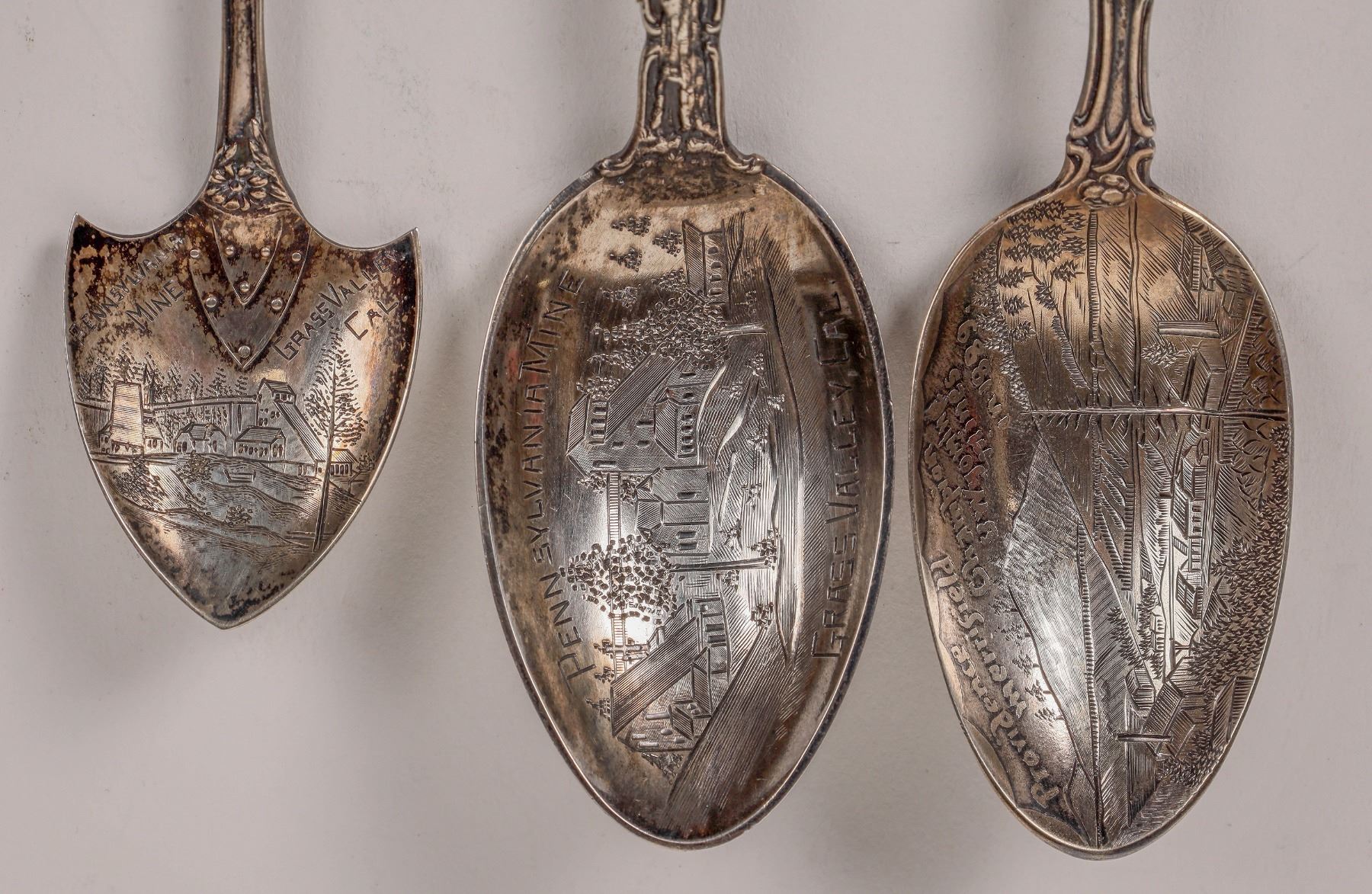Sterling silver souvenir spoons commemorating specific mines in Nevada County, California. mines named on the spoons are The Pennsylvania Mine of Grass Valley on one spoon, Providence, Merrifield, Champion & Wyoming Mines on another and the Pennsylvania on a third. There is a date of 1889 on one of the spoons. Please see photos for more details. California Grass Valley 1900s
