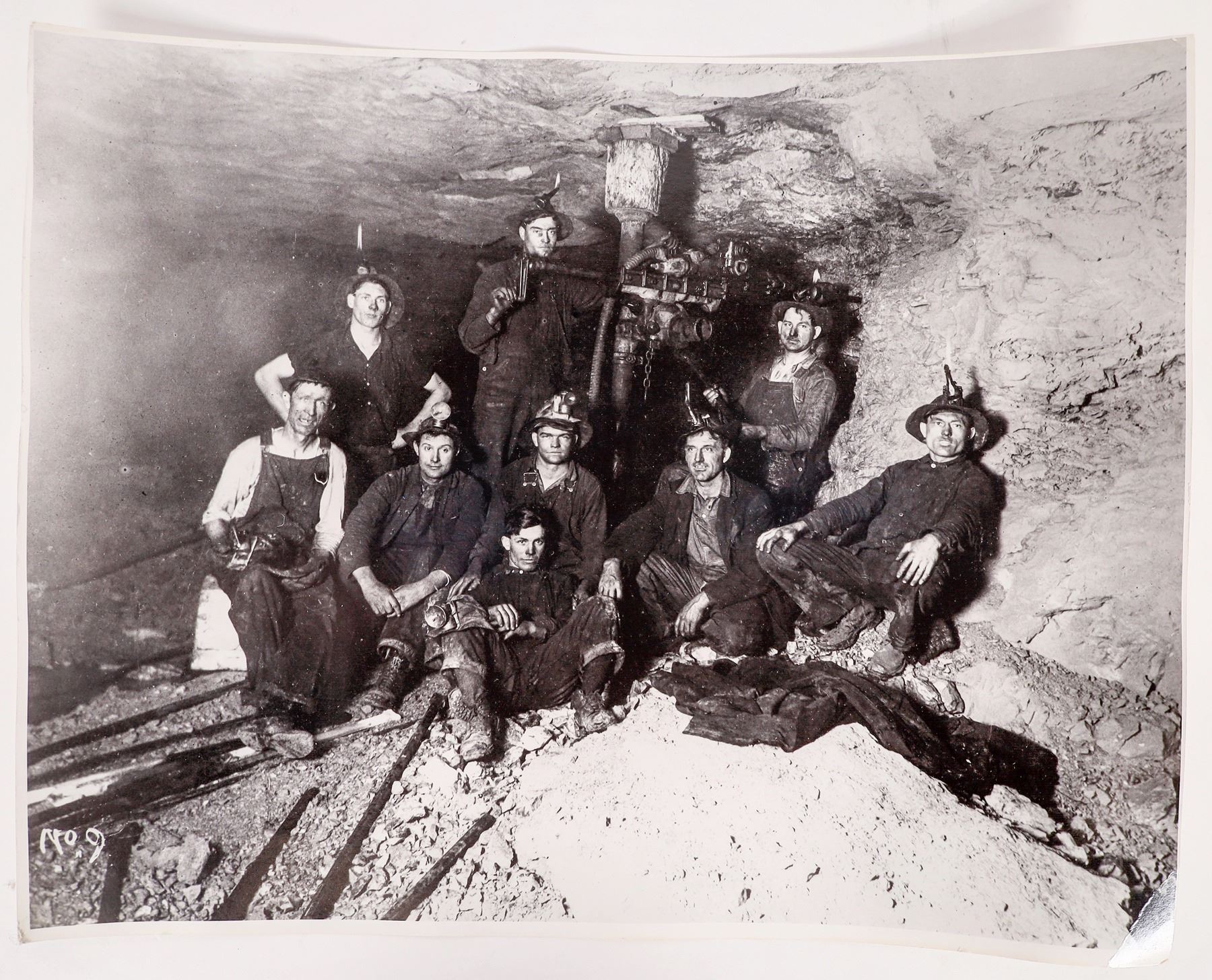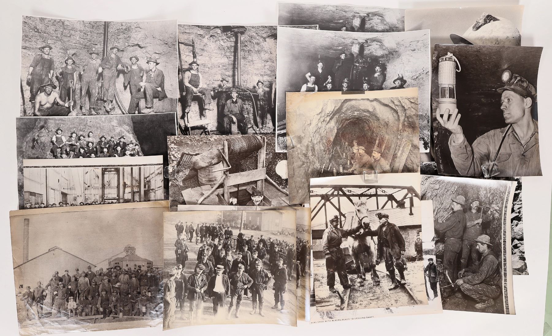Lot includes 18 photos of mining scenes and men. Two photos are duplicated. Includes: 1x 10x7.5" photo of four men standing on and around sluice box; 11x 12x10" photos of miners at work, equipment, group photos of mine workers, miners ready to descend the shaft in the elevator, miner at entrance tunnel, miners seated underground with candles for lighting, and a large group of miners standing near/around well-dressed fellow (this photo is doubled); 6x 14x11" photos of miners, miners posing in groups below ground in working conditions, large group of miners, including children, posing in front of mining and mill buildings, and miners underground working with newer equipment (this photo is duplicated). Garvis Collection.