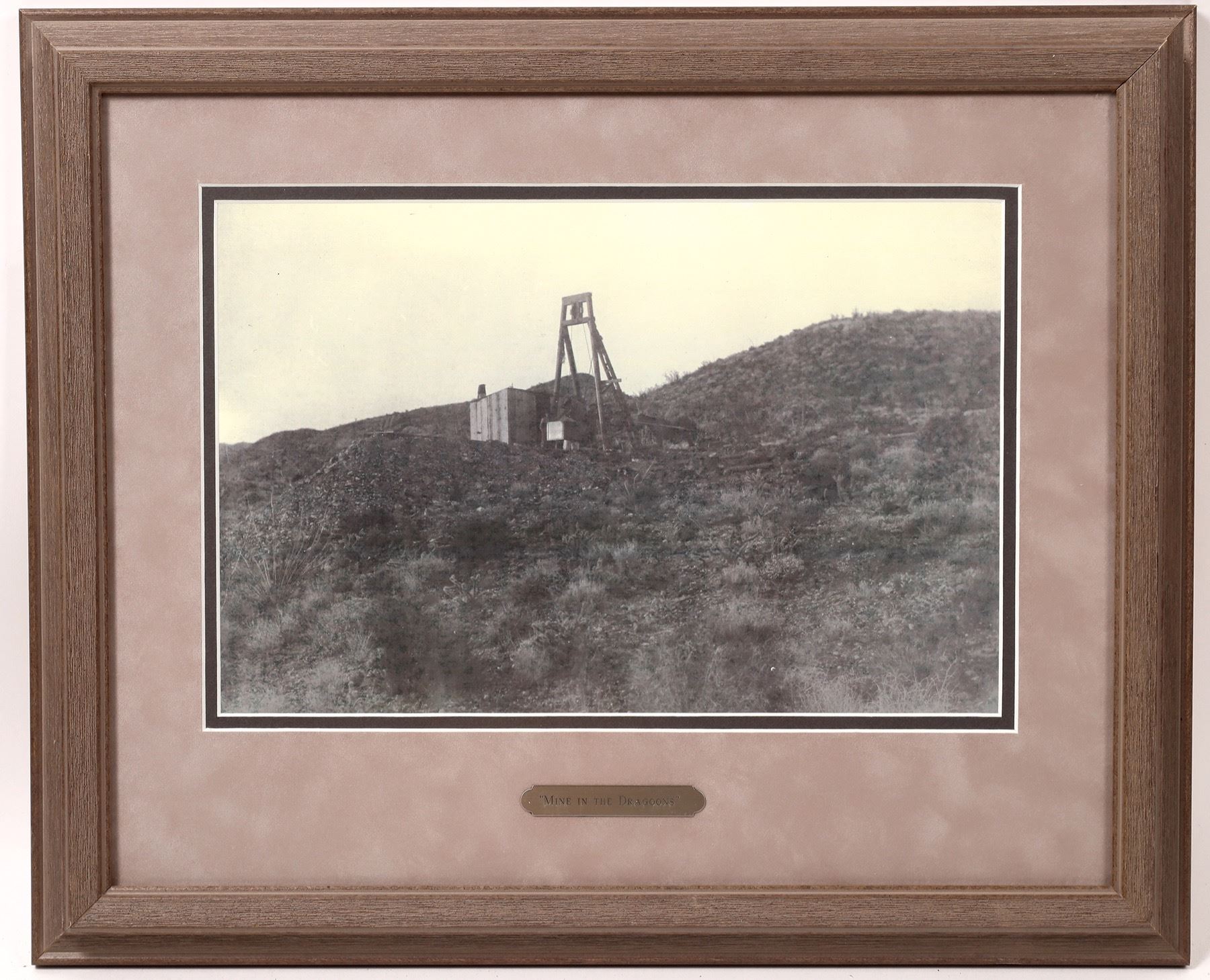 Enlarged b&w photograph titled Mine in the Dragoons. Mounted under glass and framed w/metal title plate attached to board mounting below photo. Photo size 12 1/2" x 8 1/4". Frame size: 19" x 15 1/2". Wire strung along back of frame for wall hanging. Note: Dragoon Mountains are located in Cochise County, Arizona some 60 miles southeast of Tucson. Only 25 miles long, only the highest north-facing peaks support forest vegetation and are now part of the Coronado National Forest. Elevations range from 5000' to 7500'. The Dragoons were mined from c. 1880s - 1940s. City: State:Arizona Date: