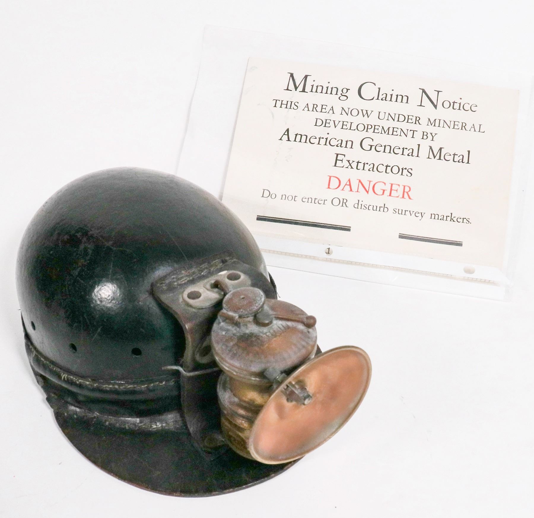 Leather Barta Headsaver miner helmet with Autolite carbide lamp. Mining Claim Notice sign, 7x9", some blue ink residue.
